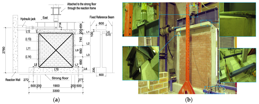 Based on previous research [], a series of cyclic tests was set by the authors, shown as Figure 5a. The frame was bolted to the strong floor. The vertical load was applied by the hydraulic jack through the steel upper spreader beam. A thin neoprene plate was placed between the frame and upper spreader beam to ensure uniform load distribution over the specimen. The horizontal load was applied by a hydraulic actuator, which was fixed to the reaction wall. The installation photo is shown in Figure 5b.