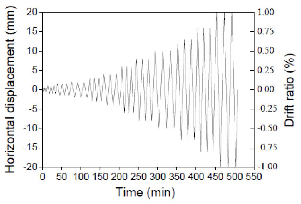 To simulate the gravity load, a constant compressive stress equal to 0.3 MPa, which is considered typical for a 3-story residential building, was applied during the test. The specimen was loaded in-plane according to the displacement history shown in Figure 6. The eastbound force and the displacements were considered “positive”. The displacement rates are listed in Table 2.