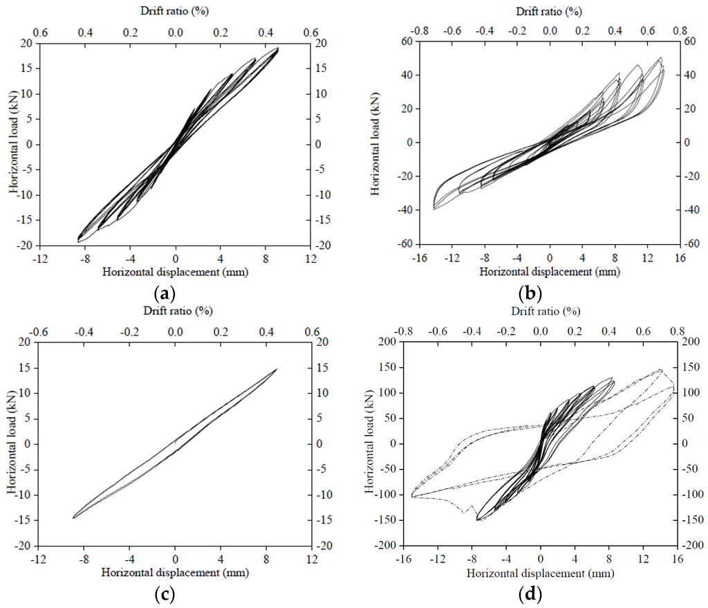 Plots of the in-plane story drift versus the in-plane lateral force for all cyclic tests are shown in Figure 8.