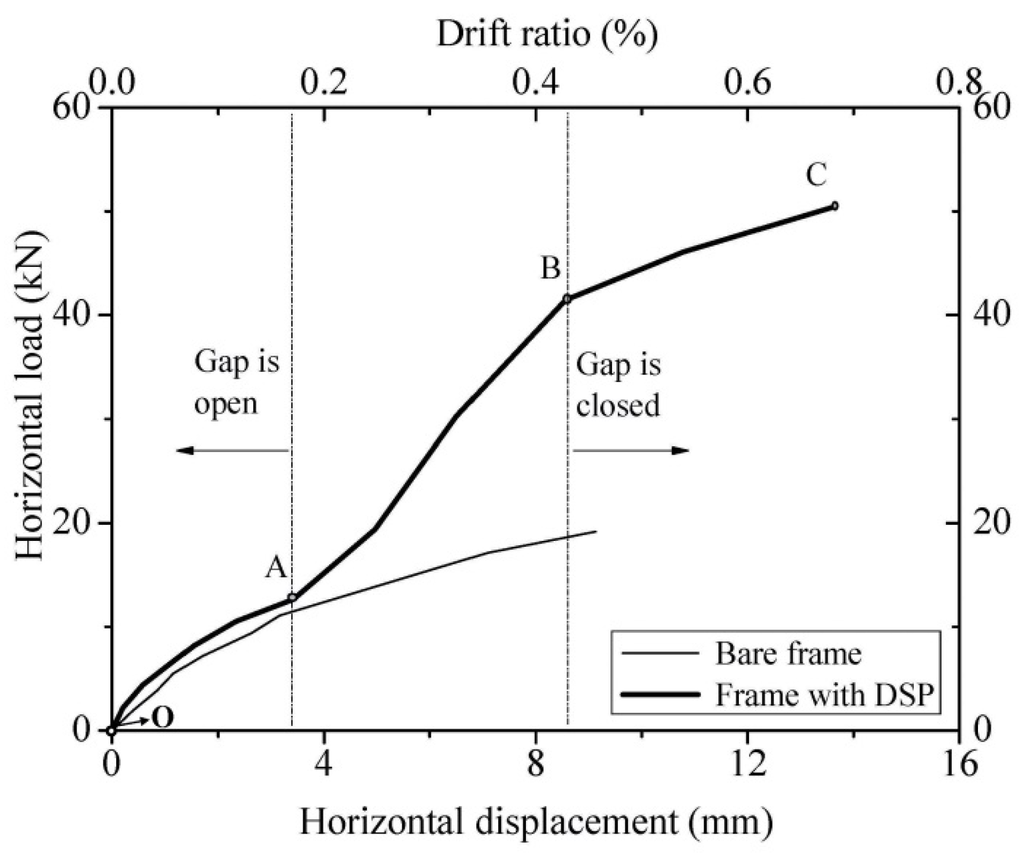 (1) The DSP increased the initial stiffness of the assembly slightly to approximately two-times that of the bare frame. The TMP increased the initial stiffness of the assembly massively to approximately 30-times that of the bare frame;