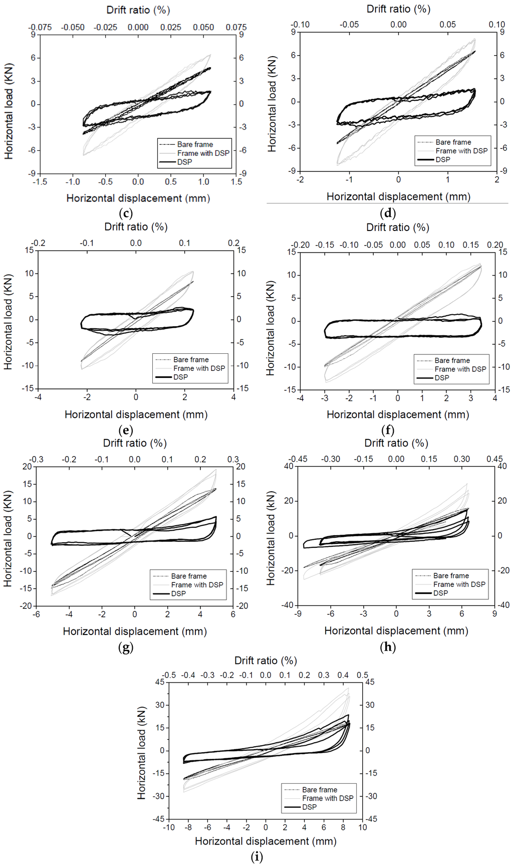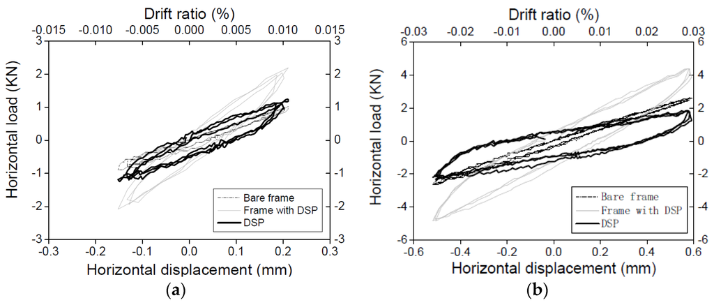 (2) In the elastic response stage of the frame (α ≤ 0.18%) [], the secant stiffness of the frame with DSP is almost the same as bare frames, while the corresponding value for the test with TMP is about six-times that.