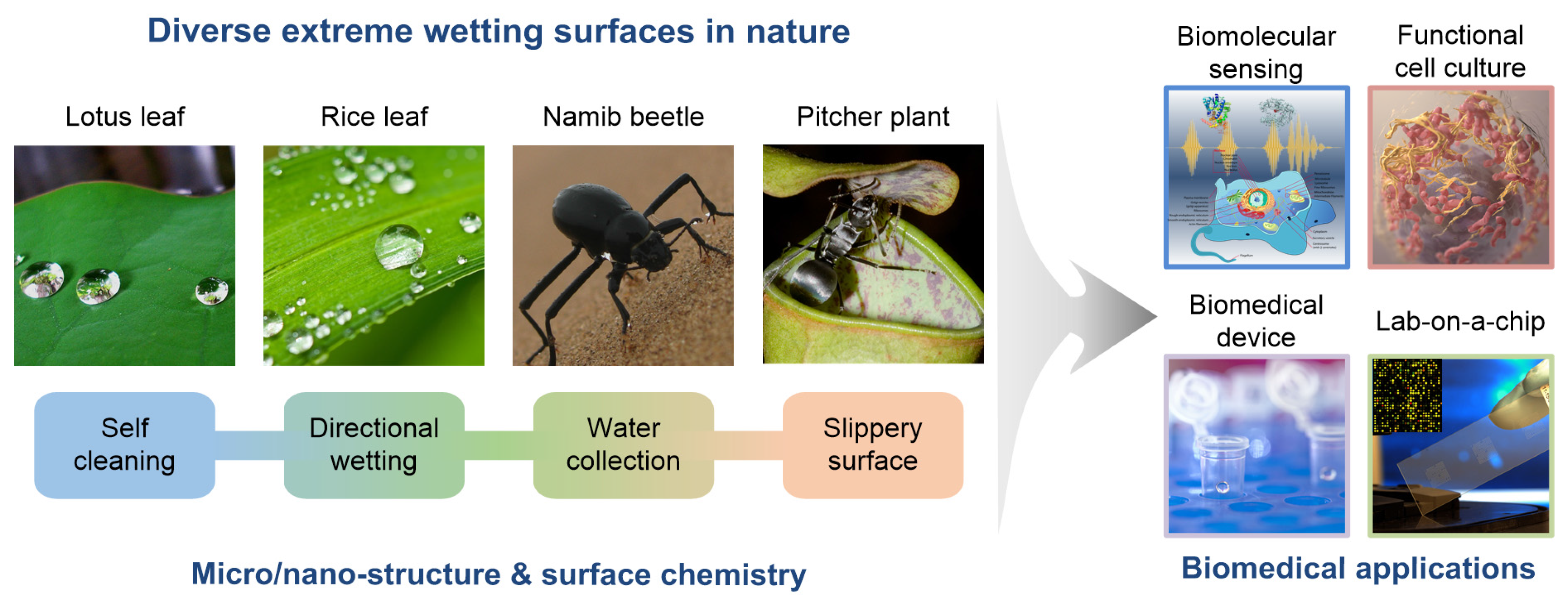 Various natural extreme wetting surfaces and their potential biomedical applications. Lotus leaf (image by Tanakawho, reproduced under Creative Commons Attribution (CC BY) license); Namib beetle (image by James Anderson, reproduced under Creative Commons Attribution Non-commercial Share-alike (CC BY-NC-SA) license); Pitcher plant (image by Bauer, reproduced under CC BY); Biomedical device (image from the School of Natural Resources & Environment, University of Michigan, reproduced under CC BY license); Lab-on-a-chip (image from Argonne National Laboratory, reproduced under CC BY-NC-SA license); and others (public domain photo and images).