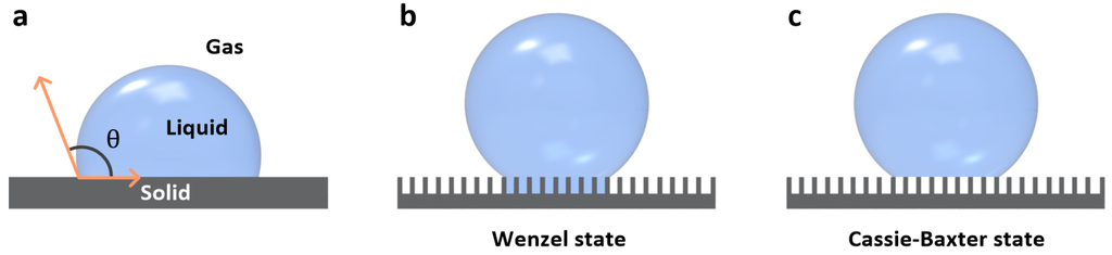 On an ideal flat solid surface (Figure 2a), a droplet forms a static CA (θ) with the surface. This CA is related to the surface energies of solid/gas (γsg), solid/liquid (γsl), and liquid/gas interfaces (γlg) in Young’s equation [31]: