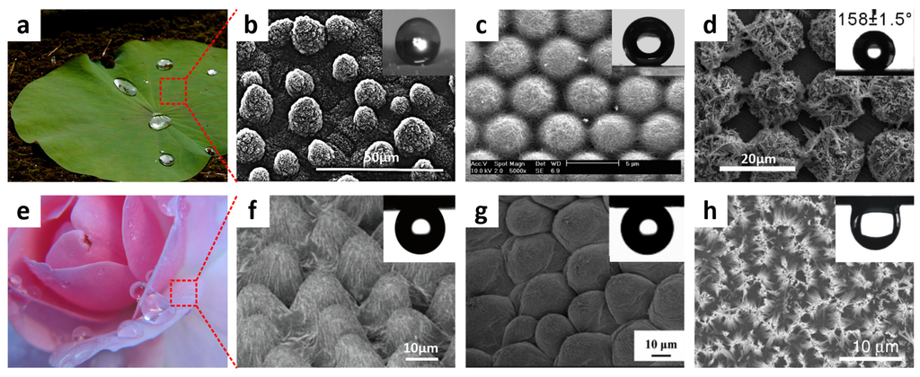 (a) Image of a lotus leaf (image by GJ Bulte, reproduced under Creative Commons Attribution Share-alike (CC BY-SA) license); (b) the corresponding scanning electron microscopy (SEM) image showing the hierarchical micro/nanostructures comprising papillose cells; (c) SEM image of a microsphere/single-walled carbon nanotube (CNT) composite array; (d) SEM image of a tetragonal array comprising Cu microprotrusions covered by nanostructured Ag dendrites; (e) Photograph of rose petals exhibiting water-adhesive properties; and (f) SEM image of rose petal surface (image by Audrey, reproduced under CC BY license); (g) SEM image of a rose petal-like polystyrene (PS)-film, onto which a water droplet was pinned even when turned upside down; (h) SEM image of Si nanowire arrays; Inset: water droplet deposited on the array after rapid thermal annealing (RTA) at tilt angle of 180°. Reproduced from [32,34,61,62,63,64] with the permission by Springer, Copyright 1997 and by ACS Publications, Copyright 2007, 2008, 2013 and by Elsevier, Copyright 2013.
