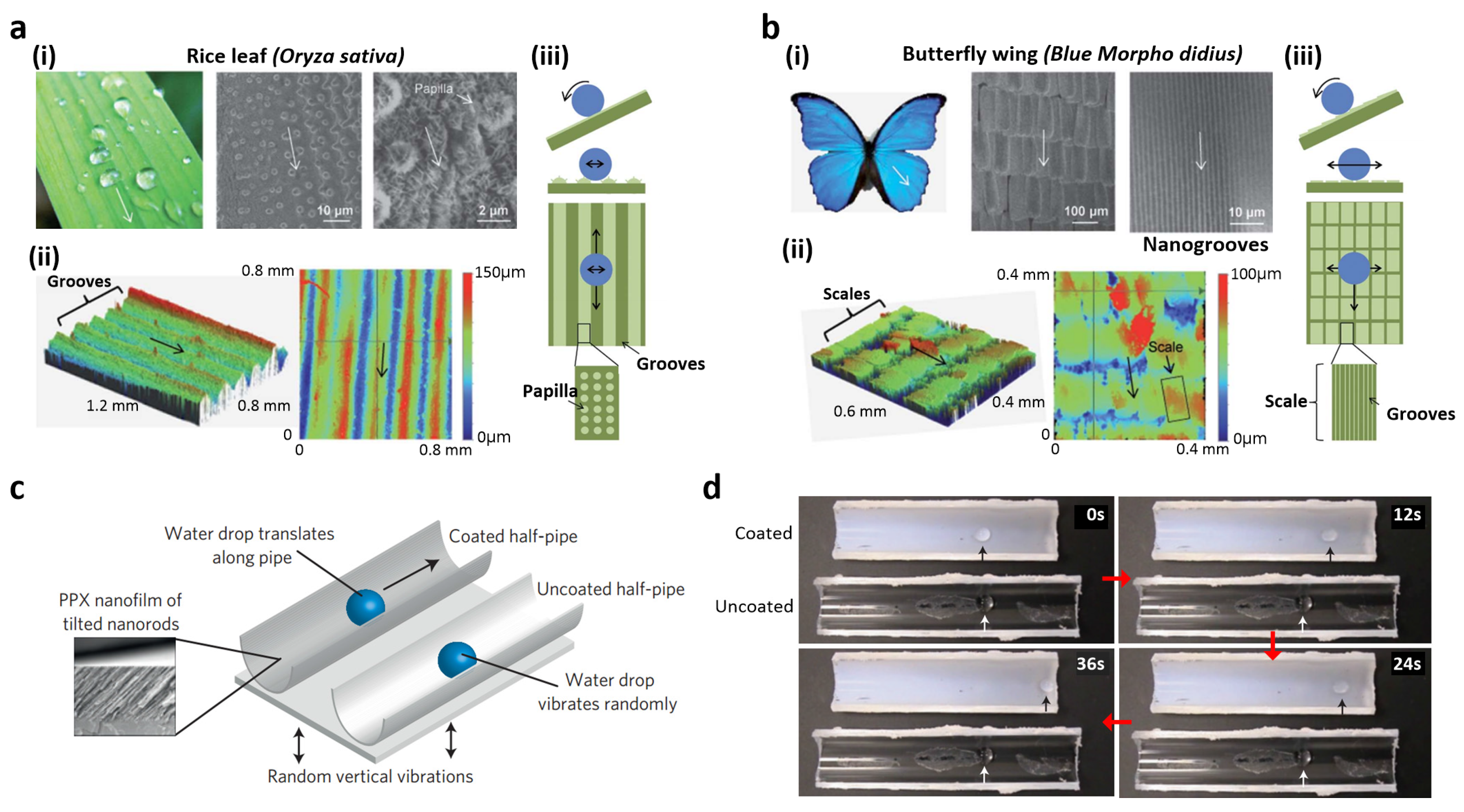 (a) Bidirectional anisotropic wetting of a rice leaf (Oryza sativa): (i) Photograph and SEM images of the rice leaf; (ii) Optical profiler height map of the rice leaf; (iii) Bidirectional anisotropic wetting behavior; (b) Unidirectional wetting behavior of a butterfly wing (Blue Morpho didius): (i) Photograph and SEM images of the Blue Morpho didius butterfly wing; (ii) optical profiler height map of the butterfly wing; and (iii) unidirectional anisotropic wetting behavior; (c) Droplet motion on poly(p-xylylene) film of tilted nanorods; and (d) corresponding time-lapse frames of droplet motion. Reproduced from [66,67] with the permission by Royal Society of Chemistry, Copyright 2012 and by Nature Publishing Group, Copyright 2010.