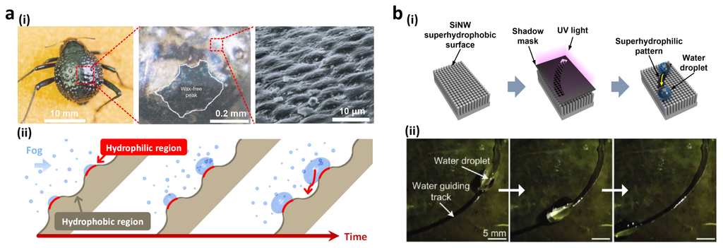 Biological organisms that live in extreme environments have adapted to survive under their environments. In particular, desert plants and animals exhibit specific features to get and conserve moisture in arid environments. Specifically, Stenocara beetles in the Namib Desert gather and condense water from fog on their bumpy back. This water-collation process relies on their hydrophilic and hydrophobic patterns existing on the back surface [12]. The wings of Stenocara are covered by a random array of hydrophilic smooth peaks and hydrophobic wax-coated rough troughs (Figure 5a(i)). Fog water settles on the hydrophilic peaks and condenses until they are entirely immersed. At a critical size, the droplet rolls down along the hydrophobic troughs (Figure 5a(ii)).