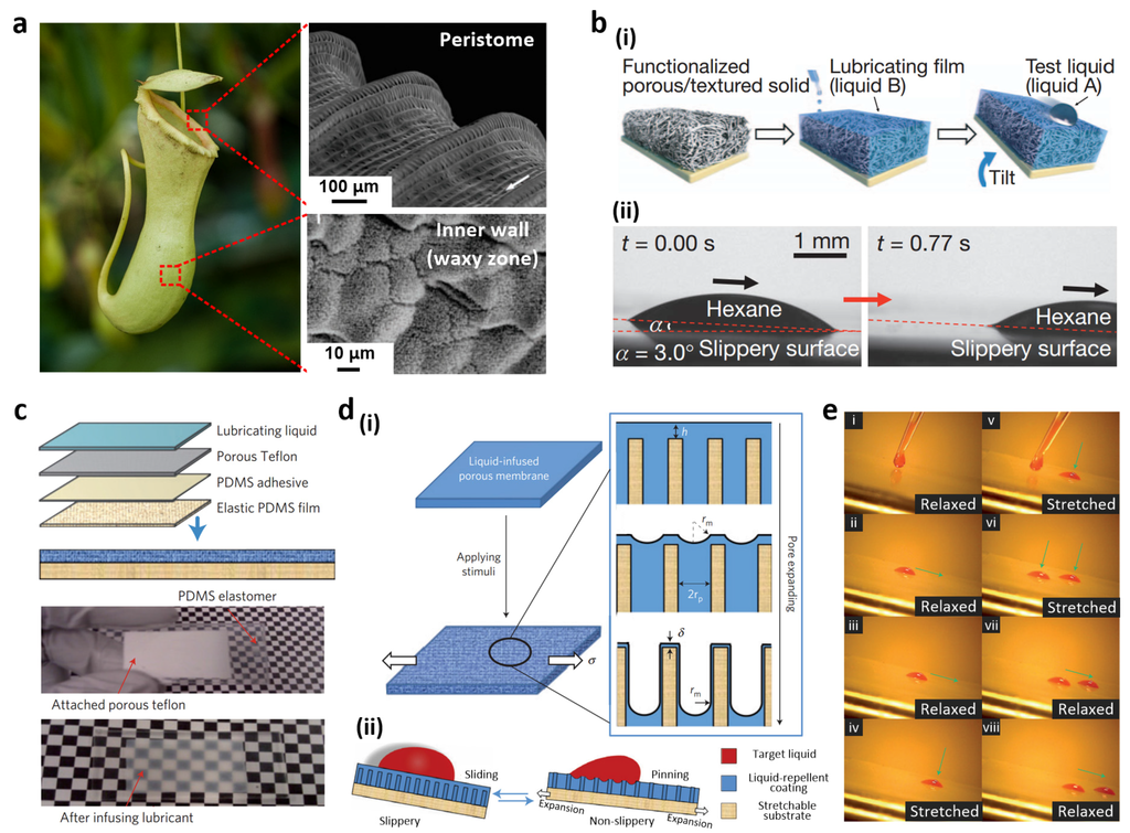 (a) Image of the Nepenthes pitcher plant (image by William Warby, reproduced under CC BY) and SEM images of the peristome surface and inner wall. The surface presents radial ridges, while the inner wall is covered with waxy crystals; (b) (i) Slippery film fabrication; (ii) Optical micrographs of a sliding hexane drop at a low angle; (c) Porous matrix formation on an elastic PDMS film and photographs of dry and lubricated substrates; (d) (i) Mechanically induced topographical changes in a liquid slippery film upon stretching and (ii) corresponding droplet motions; (e) Sequential photographs of oil droplet movement on the dynamic slippery surface. Reproduced from [13,93,94] with permission by National Academy of Sciences of the USA, Copyright 2004 and by Nature Publishing Group, Copyright 2011, 2013.