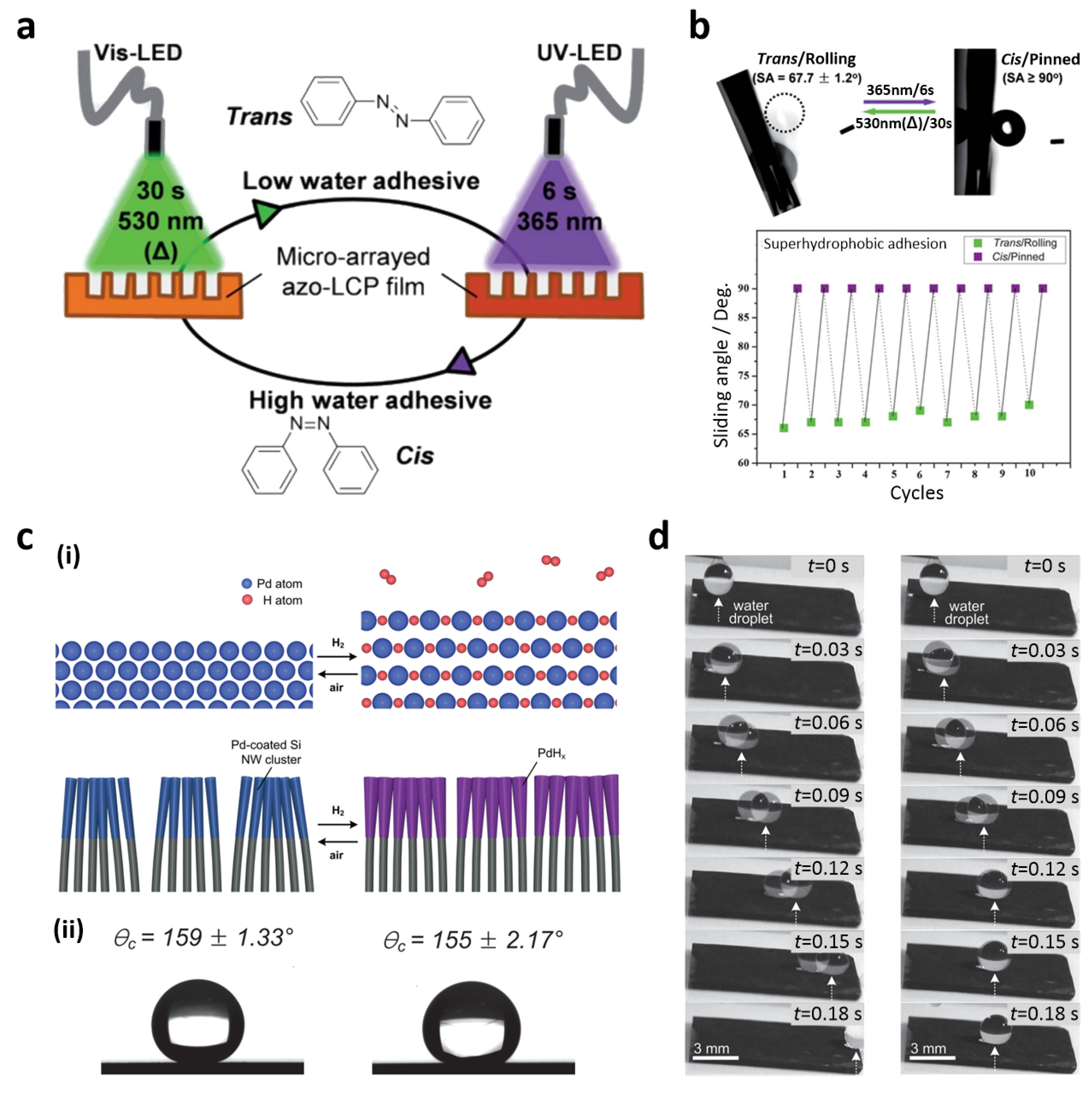 (a) Switchable adhesion under UV and visible light irradiation; (b) Reversible adhesion of superhydrophobic azobenzene liquid crystal polymer (LCP) film; (c) (i) Volume expansion of Pd layers deposited on the Si NW arrays under atmospheric and H2 ambient conditions; (ii) Contact angles (CAs) of the Pd-coated Si NW arrays showing superhydrophobicity under atmospheric and H2 conditions; (d) Time-lapse photographs of a moving water droplet on Pd-coated Si NW arrays under atmospheric and H2 conditions. Reproduced from [98,99] with the permission by Royal Society of Chemistry, Copyright 2012 and by John Wiley and Sons, Copyright 2013.