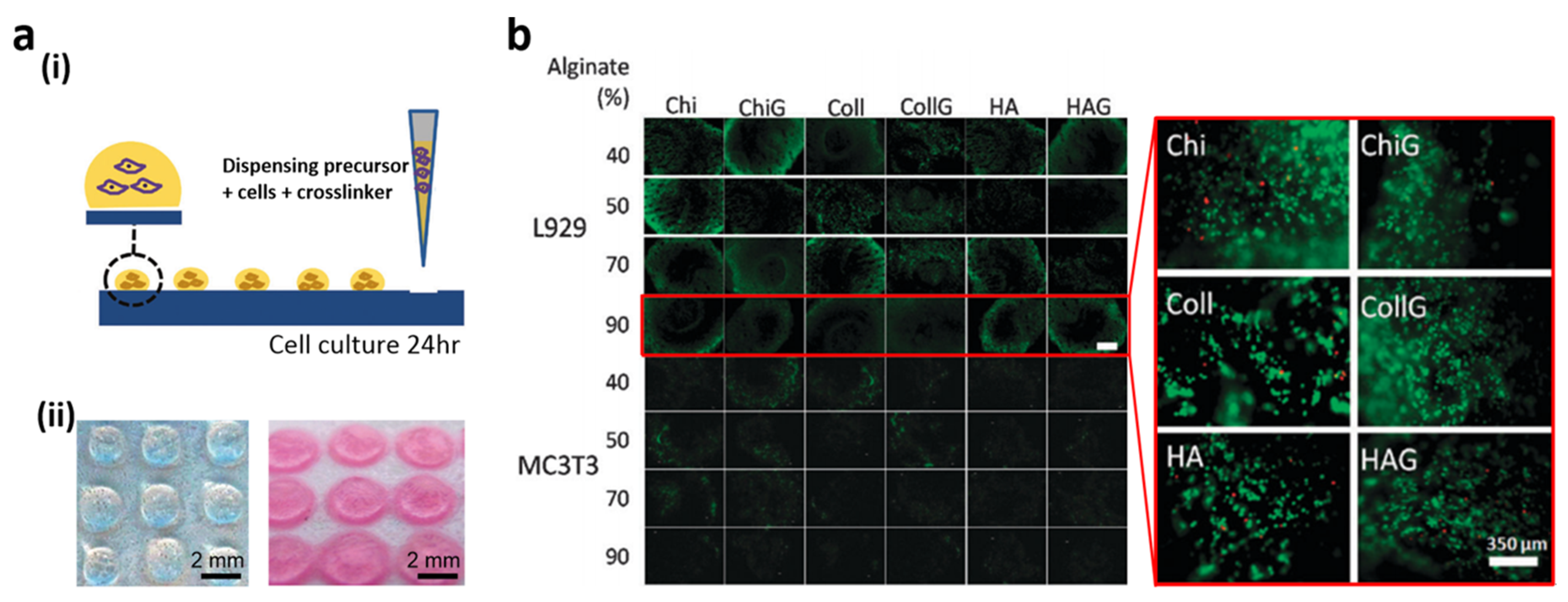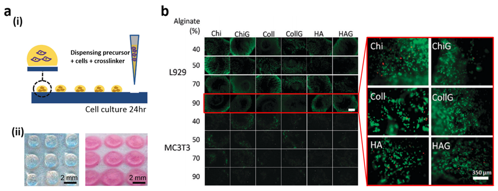 (a) (i) Three-dimensional (3D) hydrogel array on hydrophilic patterned spots; (ii) The images before and after 24 h of immersion in culture medium of alginate based 3D hydrogels; (b) Fluorescent microscopy images of live (green)/dead (red) cells in the 24 different hydrogels after 24 h of cell culture. Reproduced from [120] with permission by Royal Society of Chemistry, Copyright 2012.