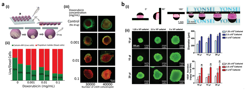 (a) (i) Hanging drop culture on the indentation-patterned superhydrophobic surface; (ii) Live (green)/dead (red) cell ratios 24 h after the addition of various doxorubicin concentrations for densities of 30,000 (left bar) and 40,000 (right bar) cells/droplet; (iii) Fluorescent images of L929 spheroids in the presence of doxorubicin (ii); (b) (i) Culture medium droplets adhered on the H2-exposed Pd-coated Si NWs for different tile angle (0°, 90°, and 180°) and medium volumes (5, 10, 15 and 20 μL); (ii) Live/dead cell staining, size distribution, and vascular endothelial growth factor (VEGF) protein secretion from spheroids after 4 days of culture at various cell densities and medium volumes. Reproduced from [18,136] with permission by John Wiley and Sons, Copyright 2014.