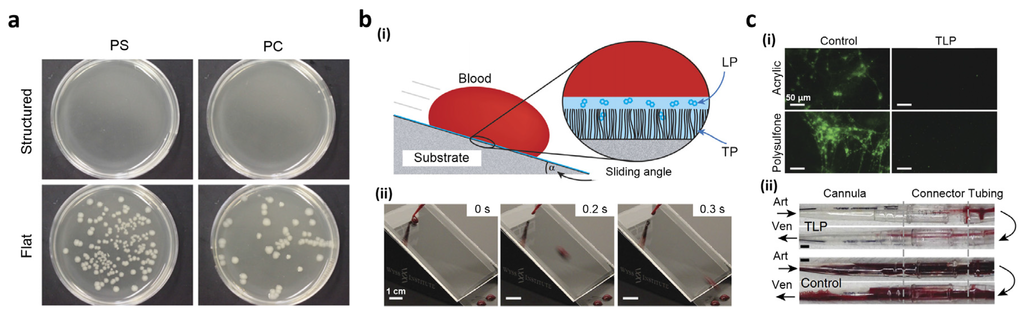 (a) The bacterial growth on the PS and polycarbonate (PC) structured and flat substrates; (b) (i) Blood repellency on slippery tethered-liquid perfluorocarbon (TLP)-coated surfaces; (ii) Photographs of a sliding blood droplet on the slippery surface; (c) (i) Fluorescent micrographs of fibrinogen on acrylic or polysulfone surfaces with or without TLP coating; (ii) Photographs of polyurethane cannulae, polycarbonate connectors, and PVC tubing with (top) or without (bottom) TLP coating after 8 h of blood flow. Reproduced from [148] under CC BY license. Reproduced from [152] with permission by Nature Publishing Group, Copyright 2014.