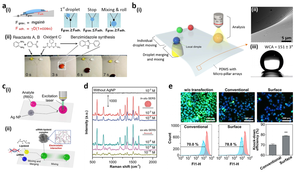 (a) (i) Droplet motion and mixing on a pDA micropatterned slippery device; (ii) Chemical reaction in organic solvent (THF) on the slippery device; (b) (i) Manipulation of water motions such as moving, mixing and analysis on a suspended PDMS substrate with micro-pillar arrays; (ii) SEM image of the dimple structure; (iii) Photograph of a water droplet on the PDMS substrate; (c) (i) Surface-enhanced Raman spectroscopy (SERS) measurement system; (ii) Small interfering RNA-lipidoid complex formation; (d) in situ/ex situ SERS analysis spectra at different concentrations of Rhodamine 6G (R6G) for R6G/Ag nanoparticle (NP) droplet mixture and an evaporated R6G/Ag NP droplet, respectively; (e) Fluorescent images and flow cytometry analyses of green fluorescent protein (GFP)-HeLa cells after transfection. Reproduced from [166,167] with permission by American Chemical Society, Copyright 2014, and permission by Nature Publishing Group, Copyright 2015.