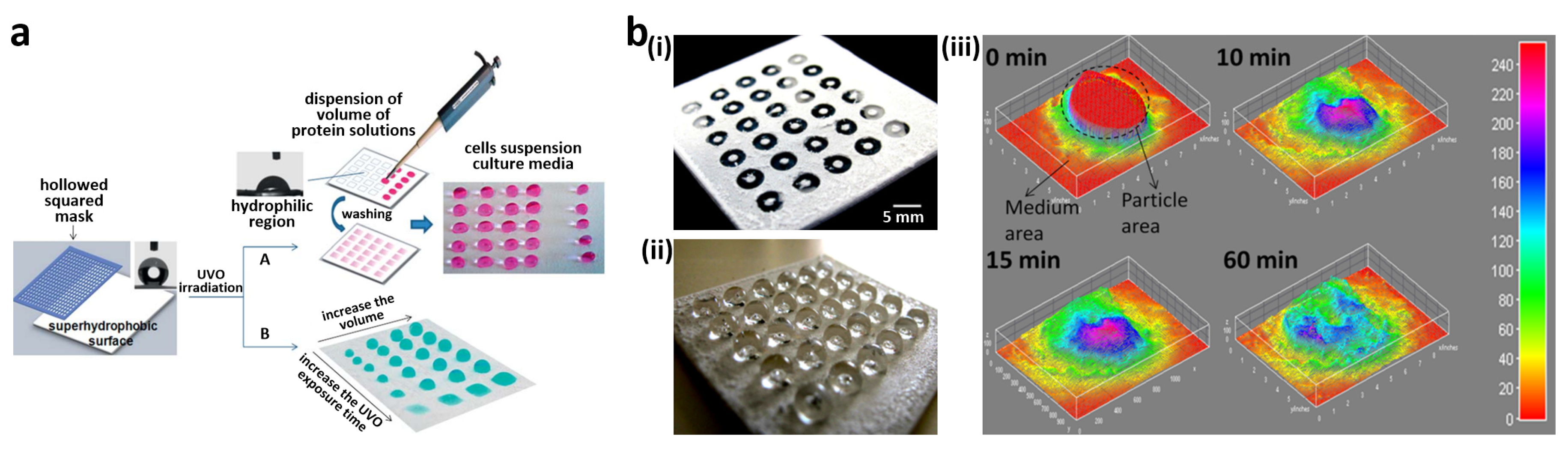 (a) High-throughput screening platform using a superhydrophobic surface patterned with hydrophilic spots; (b) (i) Superhydrophobic surface patterned with hydrophilic rings for high-throughput assay; (ii) Hydrogel- and phosphate-buffered saline (PBS) droplet-loaded substrate; (iii) Surface plots of release profiles of the fluorescein isothiocyanate labeled bovine serum albumin (BSA-FITC) from alginate hydrogels obtained by the acquisition of fluorescent microscopy images. Reproduced from [19,173] with permission by American Chemical Society, Copyright 2011, 2013.