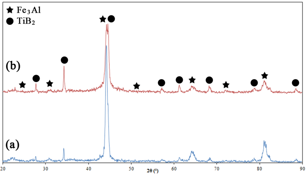 During the last few decades, Fe3Al and FeAl intermetallics have been of significant interest due to their properties such as relatively low density, relatively high melting point and remarkable resistance to corrosion under sulfidizing and oxidizing environments. Iron aluminides have also been reported to show excellent wetting to carbide and boride phases, making them suitable binders for TiC or TiB2-based cermets. However, limited room temperature ductility (less than 5%) and poor wear resistance have been the principal obstacles to the acceptance of iron aluminides in many applications. It seems that the low wear resistance of iron aluminides has a correlation with their hardness and Young’s modulus. Microstructures containing second-phase hard particles can exhibit higher dry sliding wear resistance compared to single-phase materials [1,2]. Thus, in the case of an iron aluminide/ceramic composite, combined properties of the matrix and ceramic component may result in hardness increase and, consequently, higher wear resistance.