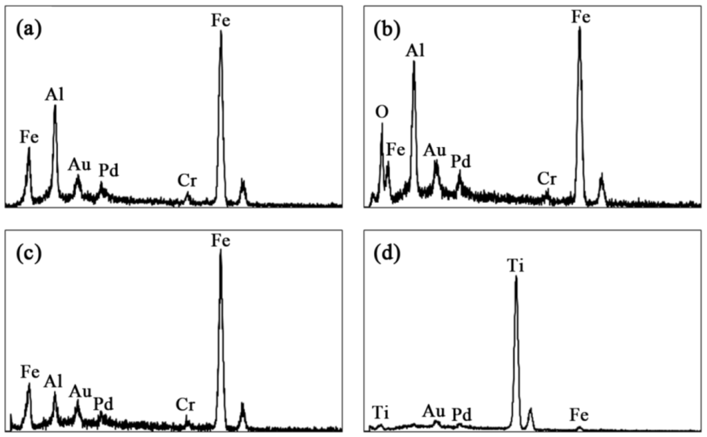 EDS spectra of the (a) main grey phase in Fe3Al coating, (b) dark grey oxide inclusions, (c) light grey areas and (d) TiB2 particles.