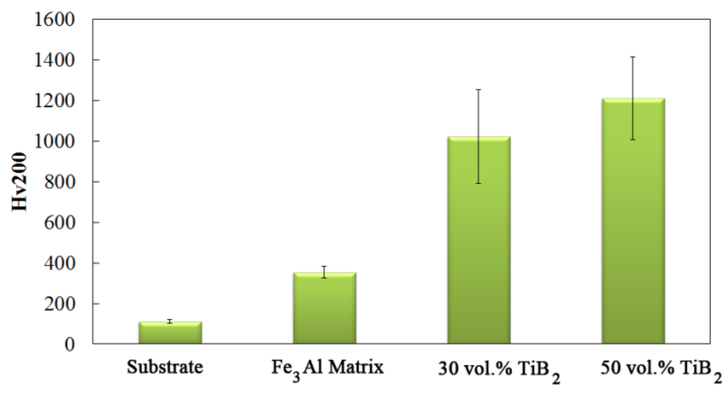 Figure 4 shows the Vickers hardness (Hv200) of the substrate and the coatings with different TiB2 contents. Very low hardness value was observed for the Fe3Al coating. As expected, the hardness is strongly affected by the TiB2 content in the matrix. It is clear that the addition of titanium diboride significantly increases the Vickers hardness. A very high hardness value of about 1200 was observed for the 50 vol.% TiB2 sample. This value is three times greater than that of the Fe3Al coating. One can observe that the error bar in the Vickers hardness is much larger for the composite samples. This might be as a result of microstructural inhomogeneity at small length scale, since the indentation section is too small, being in the range of dispersion inhomogeneity. According to Melendez and McDonald [14], it is common for such coatings to exhibit high standard deviations due to non-homogeneous distribution of reinforcing particles. The Vickers hardness measurement depends on whether the indenter is located on areas with a high concentration of TiB2 reinforcement or on areas with a high concentration of iron aluminide matrix.