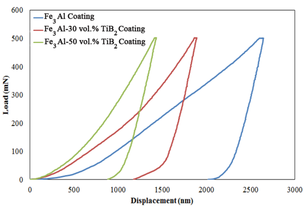 Typical load-displacement curves for Fe3Al and Fe3Al-TiB2 composite coatings are presented in Figure 5. The average results from all microindentation tests are indicated in Table 2. In Figure 5, it can be seen that as the TiB2 fraction increases, the displacement and indentation depth decrease. In addition, the hardness and the elastic modulus of the coatings increase as well as the H/E ratios with the addition of ceramic particles. The hardness and elastic modulus of the Fe3Al-based coatings increase by more than 300% and 200% respectively due to the addition of TiB2 particles. This enhancement can be attributed to the strengthening effects of well-dispersed hard TiB2 particles with strong interfacial bonds in the iron aluminide matrix. Xu and Liu [2] have investigated the effect of in-situ synthesized TiB2 particulates on the wear characteristic of the Fe-Al-Ti-B system, and similar increases of hardness and elastic modulus have been reported.
