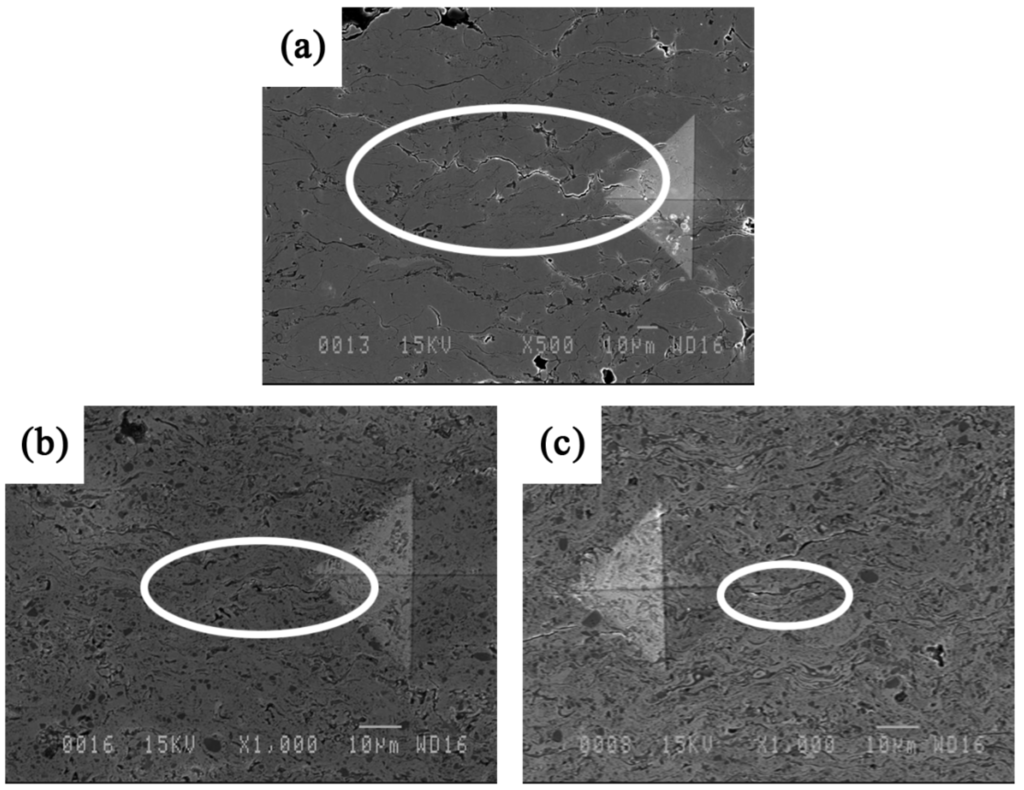In thermal sprayed coatings, the preferential propagation path of cracks is mostly parallel to the substrate [16,17]. SEM images in Figure 6 show the crack propagation in a cross section of coatings due to Vickers indentations. In Fe3Al, cracks propagate along the weak inter-splat interfaces. The crack in Figure 6a for the Fe3Al appears to be quite long (>100 µm) compared to those observed in the composite specimens (Figure 6b,c). Crack deflections as a result of the presence of TiB2 particles may be a reason for the enhancement of the mechanical properties of such composite materials.