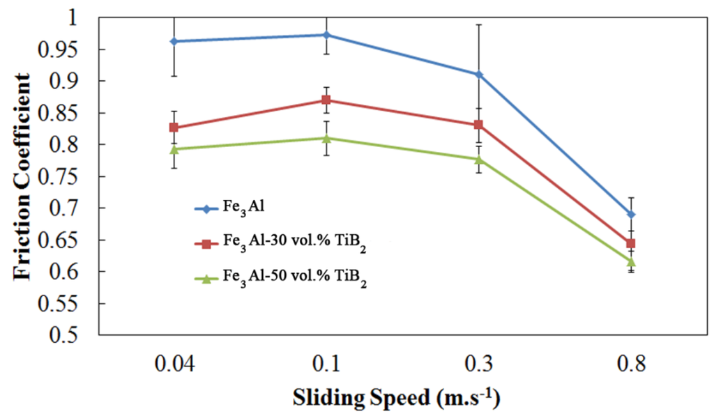 The friction coefficients of Fe3Al and composite specimens show a relatively stable trend with increasing sliding speed up to 0.3 m·s−1 and then decrease at higher speed. High sliding speed often leads to local heating and surface oxidation [21]. The changes in the nature and morphology of the surface at high speed, which may lead to a reduced contact area, decrease the friction coefficient and the wear of the components, as will be discussed in the next section.