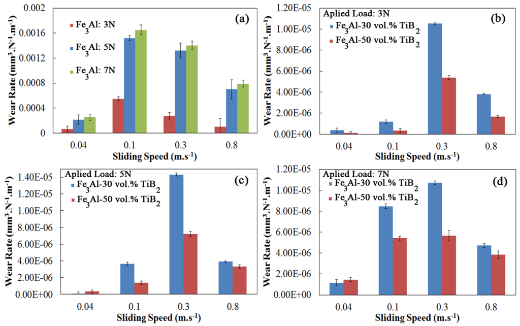 Wear rates as a function of sliding speed and applied load. (a) Fe3Al coatings and (b–d) composite coatings.