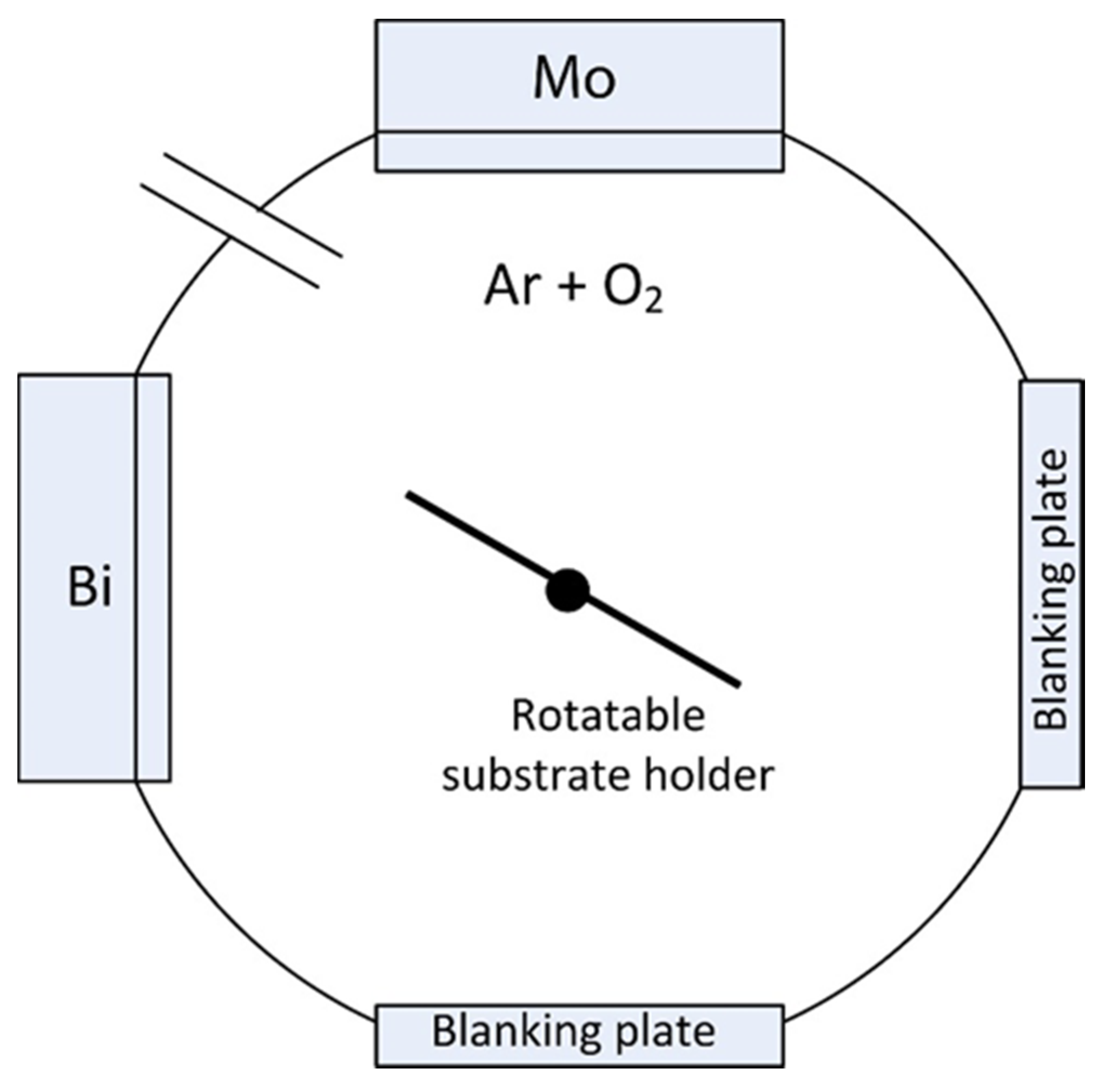 Bismuth molybdate coatings were deposited in a Teer UDP450 sputtering rig (Teer Coatings Ltd., Droitwich, UK) from two 300 mm × 100 mm vertically opposed type II unbalanced planar magnetrons, installed through the chamber walls in a closed field configuration. The arrangement was similar to the one reported in earlier work [24], with a bismuth target fitted on one of the magnetrons and molybdenum target on the other one; both targets used were 99.95% purity. The schematic representation of the Teer UDP450 sputtering rig is given in the Figure 1. The targets were driven in pulsed DC mode using a dual channel Advanced Energy Pinnacle Plus power supply (Advanced Energy, Fort Collins, CO, USA); a pulse frequency of 100 kHz and duty of 50% (synchronous mode) were used for all the deposition runs. The target powers were varied systematically in the range from 100 to 500 W to vary the bismuth:molybdenum ratio in the coatings. The reactive sputtering process was carried out in an argon/oxygen atmosphere at a pressure of 0.3 Pa. The gas flows were controlled with mass flow controllers: 40 sccm of argon and 28 sccm of oxygen. The soda-lime glass substrates used in this work were ultrasonically cleaned in propanol prior to deposition and mounted on the electrically floating rotatable substrate holder. The rotation speed was set at 8 rpm for all coatings produced in this work. The distance between targets and substrate holder was 10 cm.