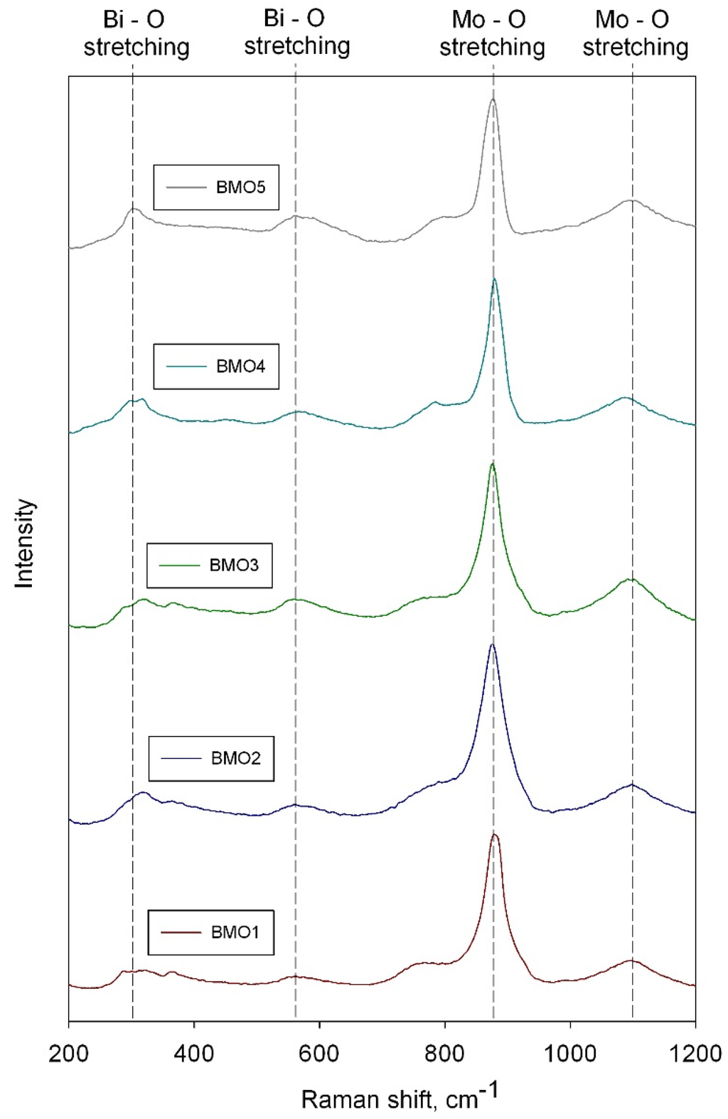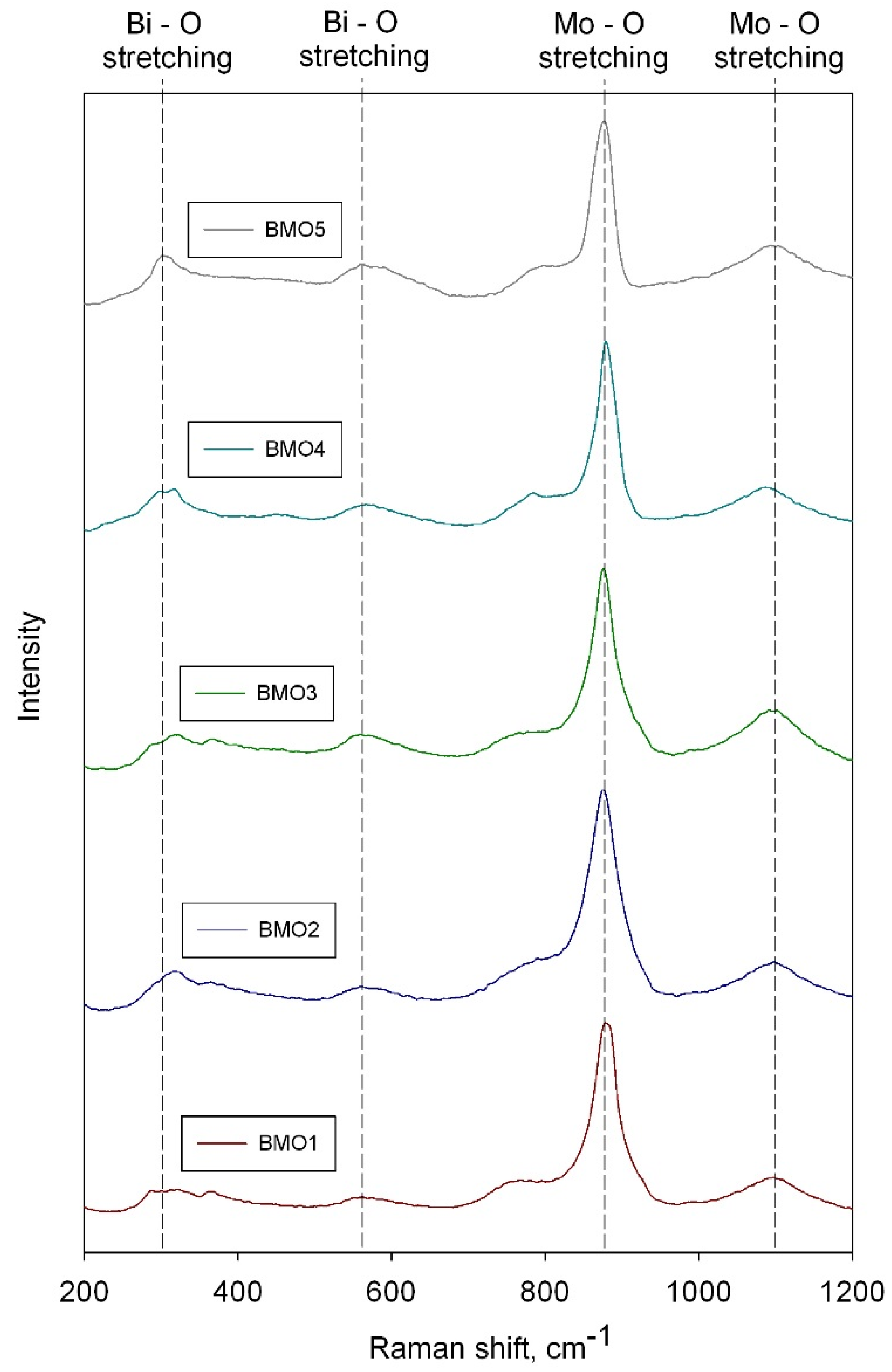 Raman spectroscopy is a powerful technique for phase characterization of transition metal oxides by recording and assigning different frequencies of Raman spectra to different molecular structures. The Raman spectra of the coatings annealed at 673 K are shown in the Figure 3. It can be seen that all the samples showed characteristic bands of γ-Bi2MoO6, with very strong bands at around 880 cm−1 and medium bands at around 1100 cm−1 which correspond to Mo–O bond stretching, and medium bands in the region of 570 and 315 cm−1, corresponding to Bi–O–Mo and/or Bi–O bonds stretching [29,30]. This information is in good agreement with Raman spectra literature data for thermally treated γ-Bi2MoO6 [31].