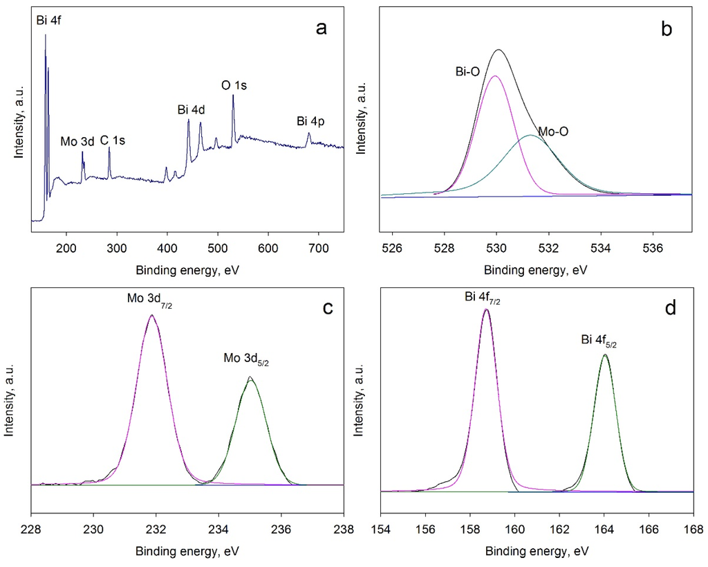 The survey spectrum is represented in Figure 5a; the presence of the carbon (C 1s peak) is typically explained by adventitious carbon contamination. Judging from the position of this peak, which is normally observed at 284.8 eV and commonly used as reference peak [32], it can be seen that the peaks are shifted to lower binding energies by approximately 2.5 eV, with the C 1s peak at 282.3 eV in the present study. Peak shifts are often reported and typically explained by positive charge build up on the sample [33]. The high resolution XPS of O 1s is shown in Figure 4b. The peak is mainly attributed to Bi–O bonds at 527.4 eV and to Mo–O bonds at 528.8 eV [34]. High resolution Mo 3d and Bi 4d peaks are represented in Figure 5c,d, respectively. The peaks at 229.4 and 232.5 eV (Figure 5c) can be attributed to the Mo6+ oxidation state, while the peaks at 156.2 and 161.5 eV (Figure 5d) are assigned to the Bi3+ oxidation state.