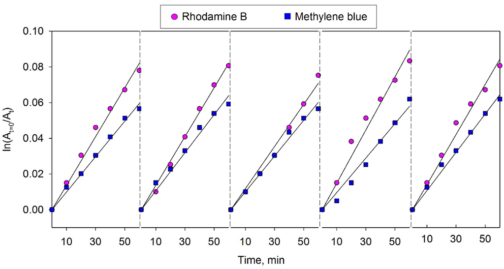 Degradation kinetics of MB and RhB during 5 cycles of dye photodegradation using sample BMO3 under visible light irradiation.