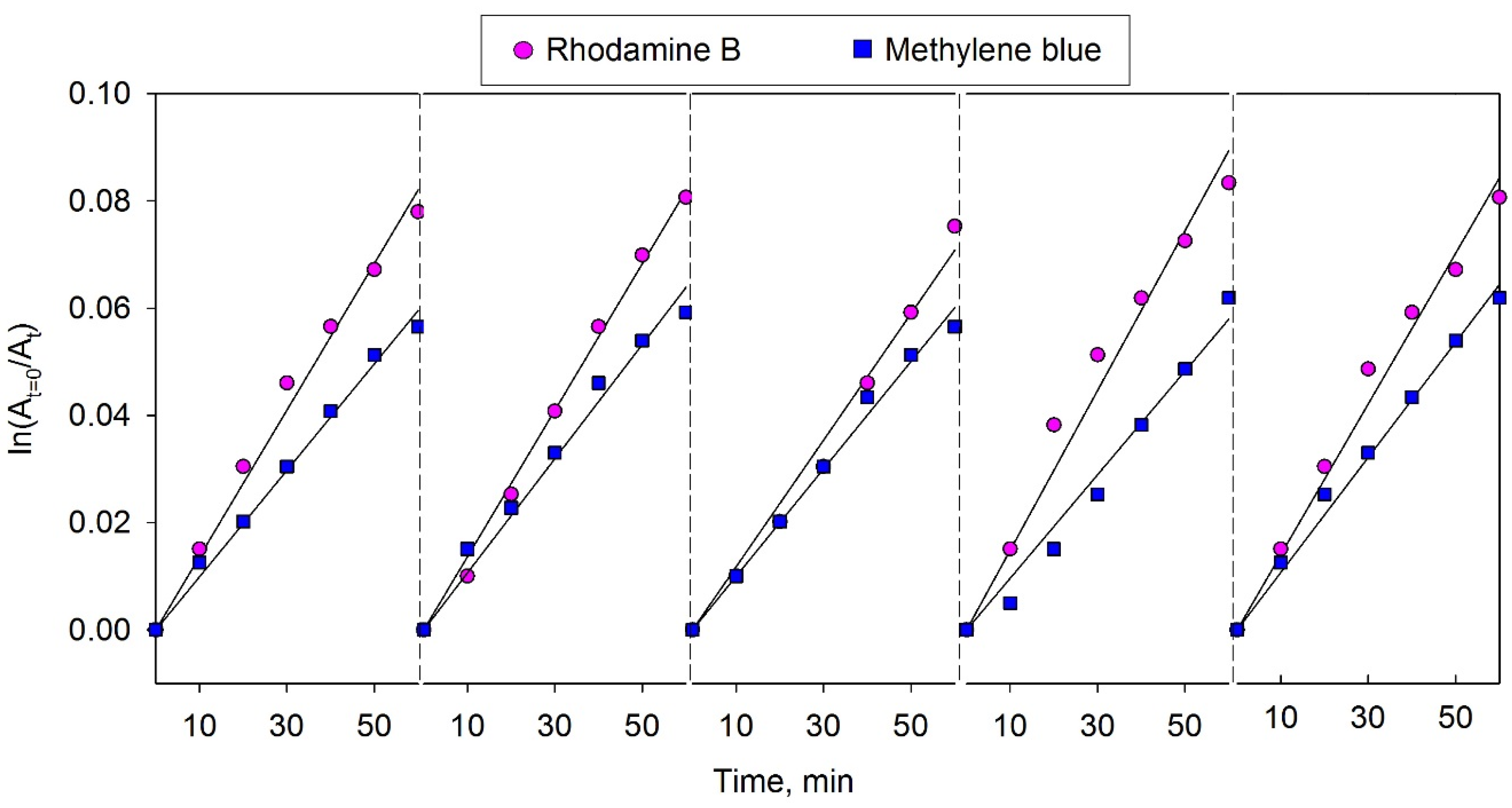 where C0 and C are concentrations of the test dye before the experiment and after 1h experimentation, respectively; ka is the first order reaction constant; t is the experiment time. Therefore, the first order reaction constants were determined as the gradients of the plots ln(A0/A) versus time (where A0 and A are the peak absorbance values of the test dye before the experiment and after 1 h, respectively).