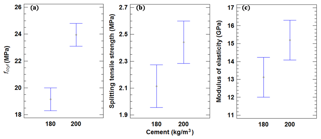(a) Mean values of compressive strength in cylindrical specimens and 95% LSD intervals vs. type of MRA. (b) Mean values of splitting tensile strength compressive strength in cylindrical specimens and 95% LSD intervals vs. type of MRA. (c) Mean values of modulus of elasticity and 95% LSD intervals vs. type of MRA.