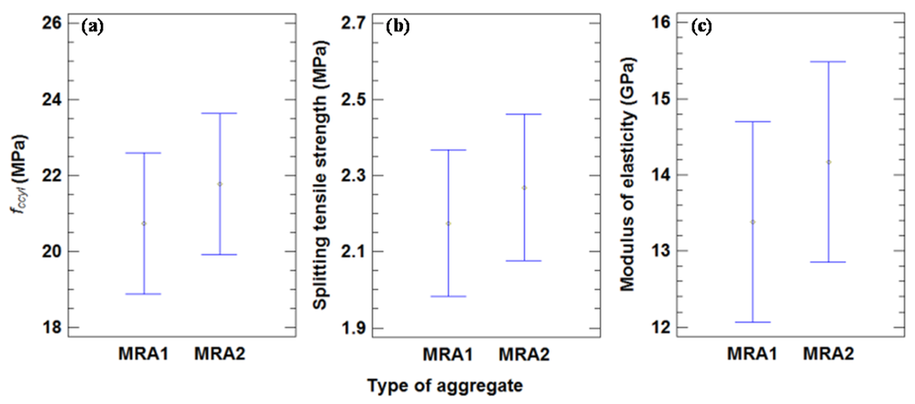There were no statistically significant differences between the mechanical properties analyzed and the type of aggregate, as shown by the overlapping bars in Figure 12. This statistical result only confirms that the RA used in this work had similar characteristics. As a comparison between the two types of aggregates, the MRA1 mean compressive strength at 28 days was 20.74 MPa, and the same value for MRA2 was 21.85 MPa. This may be because the Los Angeles value of MRA1 is higher than that of MRA2, as observed by Ramesh Kumar and Sharma [54].