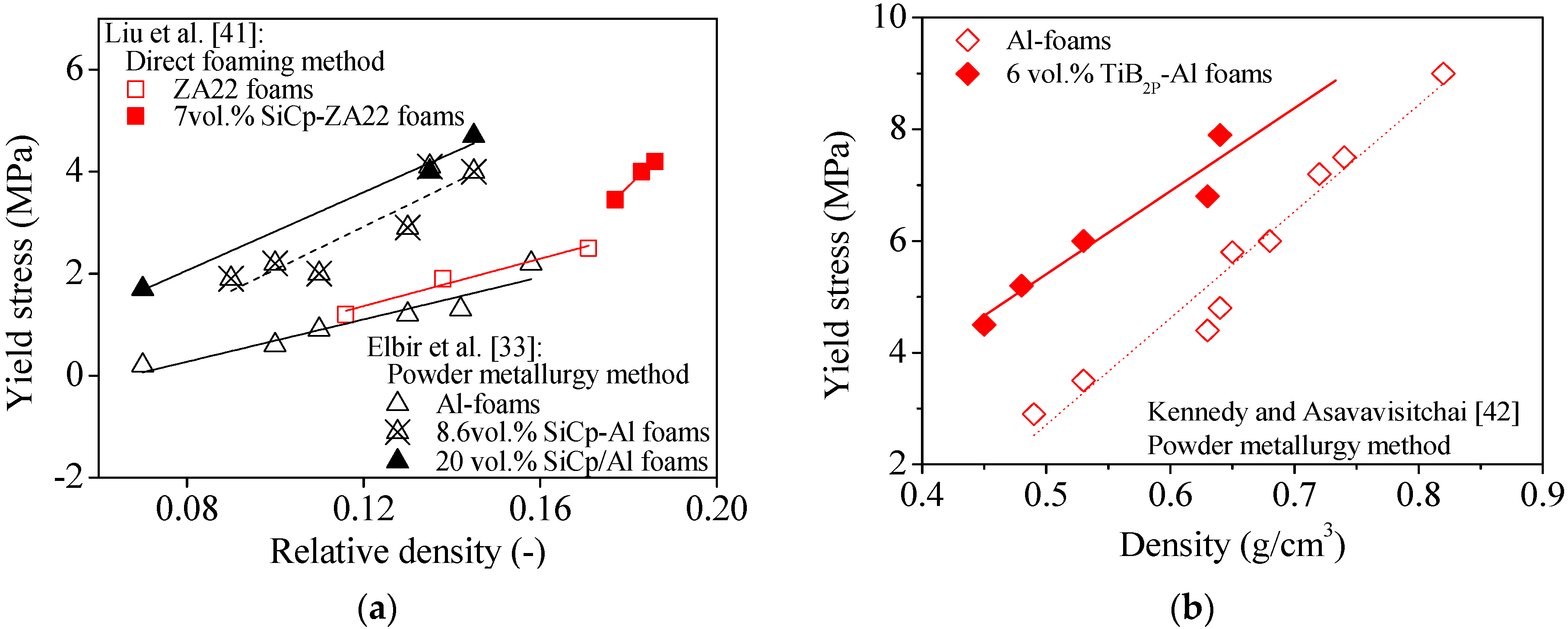 In an attempt to sort out some general trends from previous studies, Figure 1 and Figure 2 condense some published data about on the effects of micro-sized ceramic particles (SiCp, TiB2p, and Al2O3p) on the compression behavior of different metal (ZA22, Al, AlSi9Mg and AlSi7) foams produced through different manufacturing processes. The plotted data reveal that, irrespective of the foaming method and metal matrix, the yield stress of composite foams is always higher in comparison to non-reinforced ones (Figure 1 and Figure 2). The yield stress also shows a general increasing trend with increasing contents of ceramic particles as shown in Figure 1a and Figure 2a,b and Table 1 and Table 2. However, the plateau stress strongly depends on the porosity fractions, as expected.