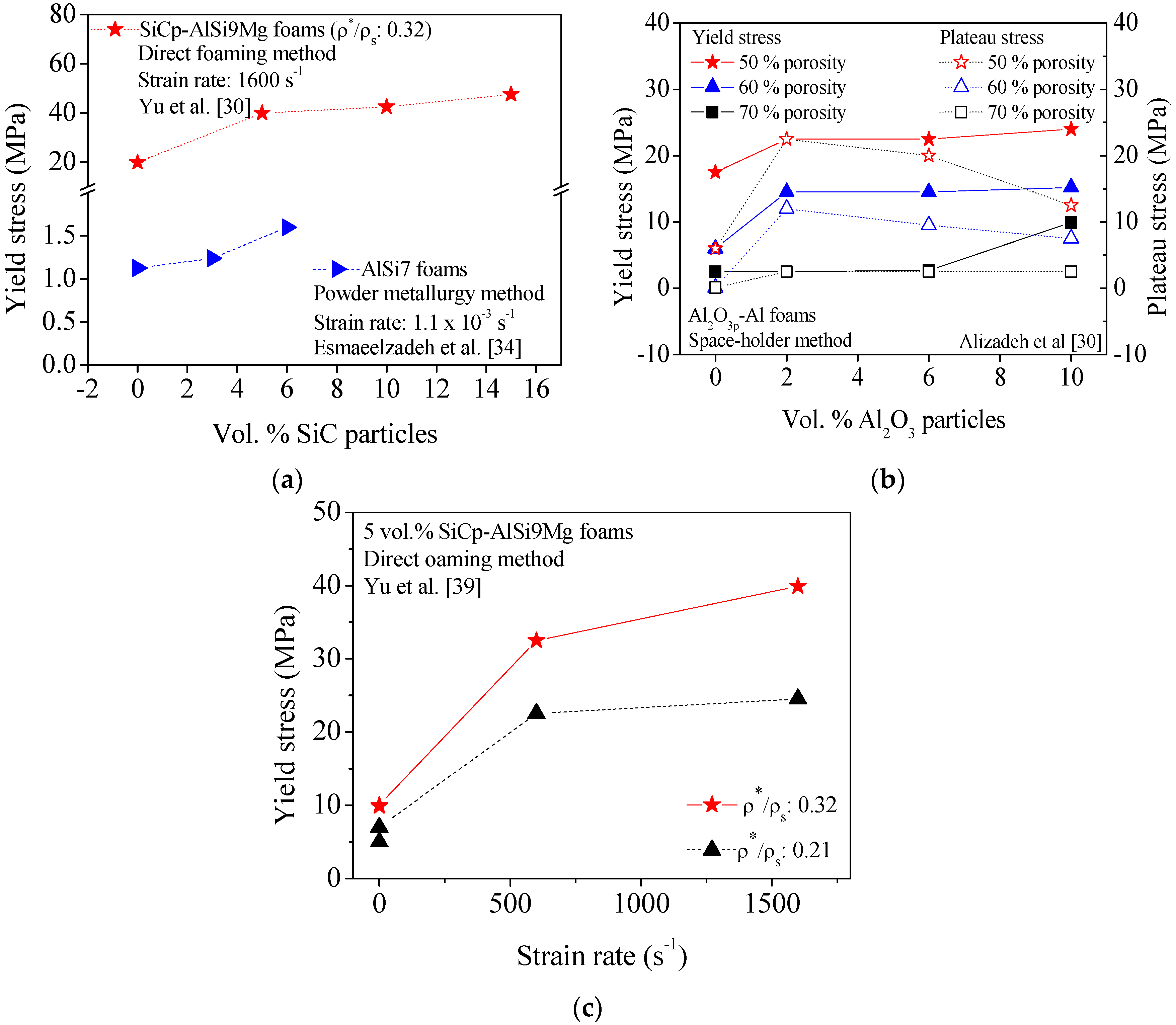 Effect of the volume fraction of particles on the yield stress (a,b) and plateau stress (b) of foams containing SiC (SiCp) (a), and Al2O3 particles (Al2O3p) (b). Effect of strain rate on compressive behavior of reinforced foams containing 5 vol.% SiC particles is displayed in (c).