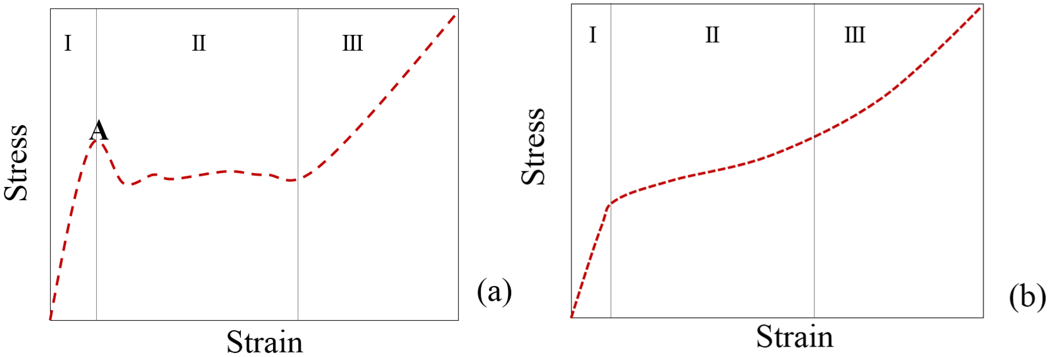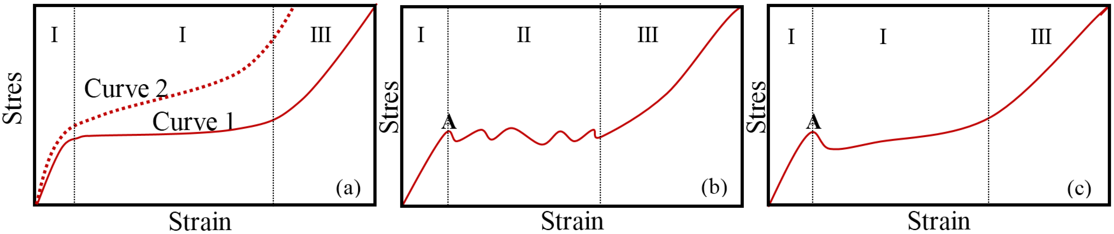Schematic representation of typical stress-strain curves (a–c) measured for metal foam under uniaxial compression characterized by quasi-static (I); plateau (II); and densification (III) regions.