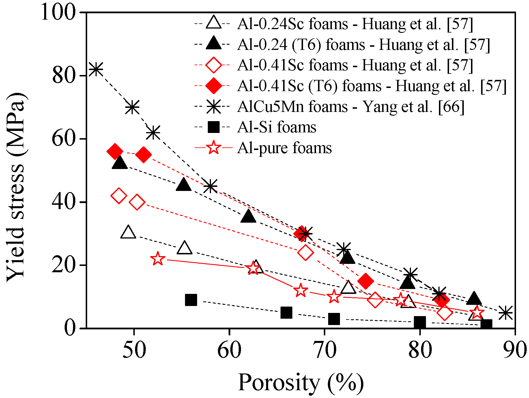 Huang et al. [57] studied the effect of scandium on the quasi-static compressive properties of Al-alloy foams. They found that the addition of small volume fraction of scandium coupled with an appropriate heat treatment of the resulting composite solid foam, improved their compressive yield strength (Figure 4), which was attributed to the formation of precipitates (e.g., Al3Sc). The effect tended to increase with increasing volume fractions of Sc, and with post heat treatment, as shown in Figure 4.