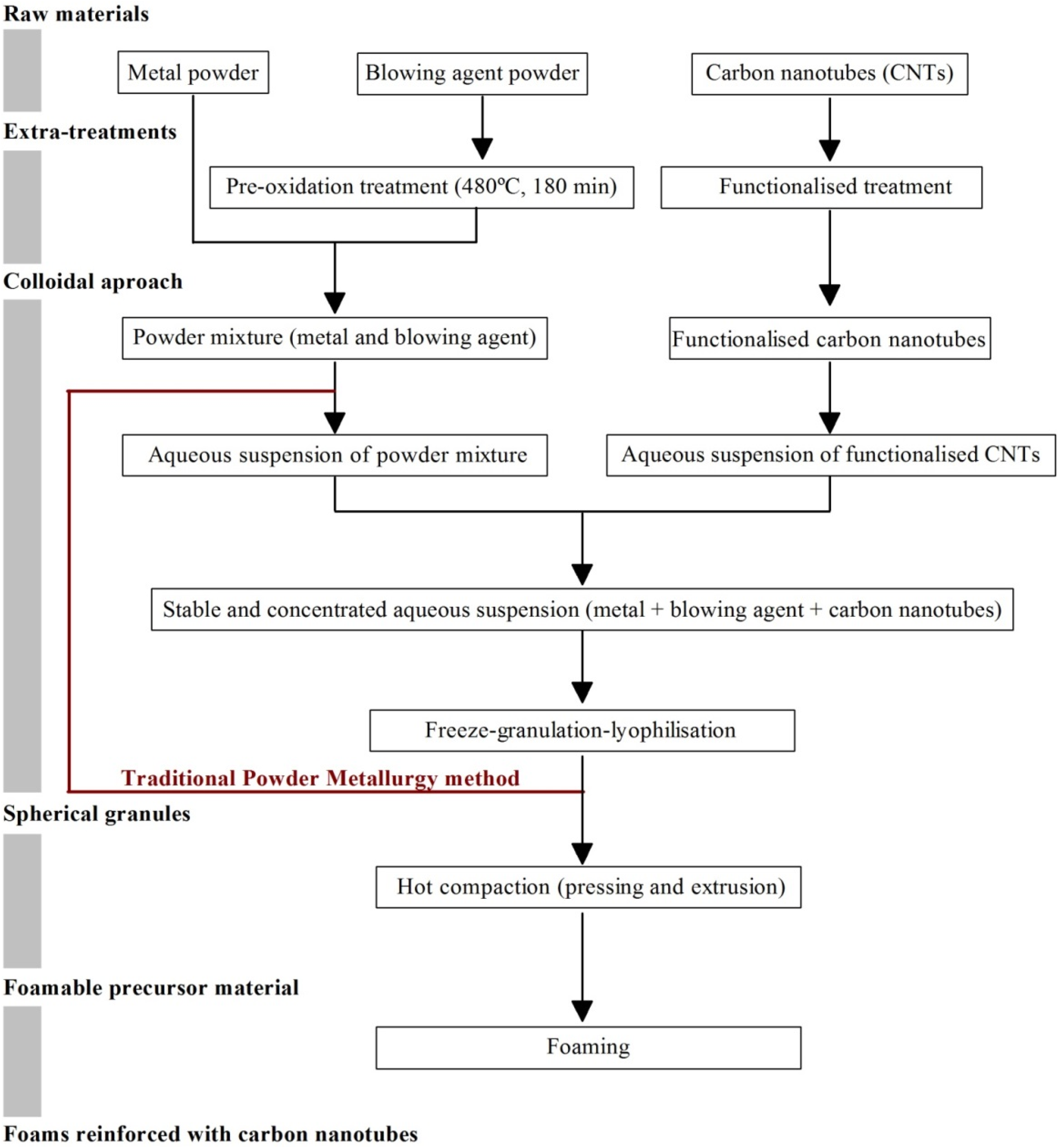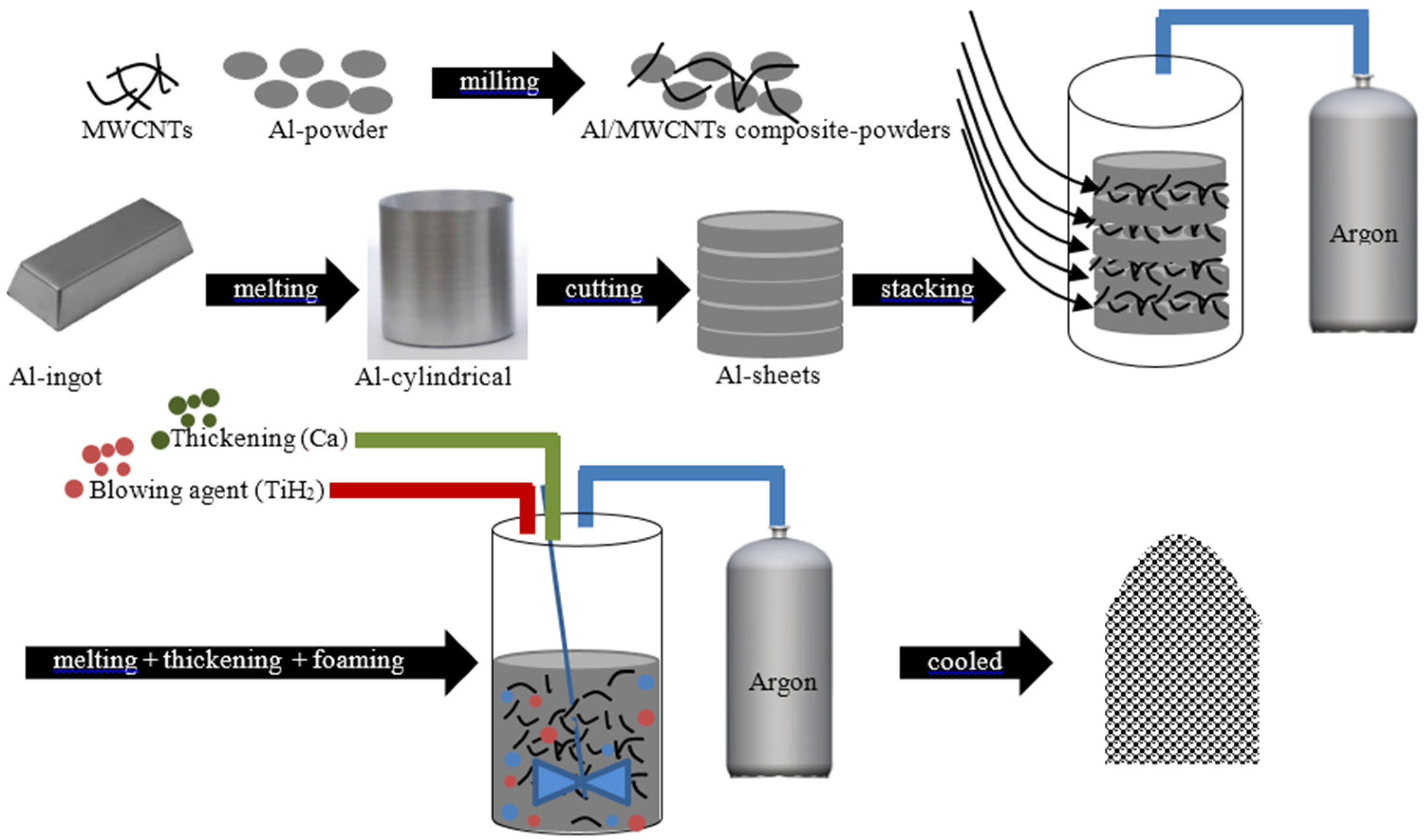 Recently, great efforts have been carried out to fabricate the high strength metal foams. Most of the ideas have emerged based on the research which has been carried out to fabricate high-strength solid metals [17,18]. One strategy for strengthening of the Al-alloys is adding alloying elements (e.g., Mg, Ni) to promote the formation of intermetallics (e.g., precipitation hardening) [17]. Another strategy is incorporating micro and nano-sized reinforcement elements into the metal bulk matrix to enhance the performance of the ductile metal [18]. For example, ceramic particles, e.g., alumina (Al2O3), silicon carbide (SiC) [17], ceramic fibers [17], ceramic nanoparticles [19] are some of the most attractive reinforcing materials. More recently, there has been a crescent interest in exploring carbonaceous materials as reinforcing agents for metal alloys [20,21,22]. This became an attractive research field both from the scientific and industrial applications viewpoints. Considerably research activities involving the metal matrix nanocomposites have been undertaken. Till to present, research efforts have been mainly concentrated on Al-alloys reinforced with carbon nanotubes [20,22]. As it is well-known, carbon nanotubes (CNTs) have high aspect ratio (i.e., length to diameter, or length to thickness ratio) and exhibit an amazing high elastic modulus and mechanical strength, as well as, excellent electrical and thermal conductivities [21]. As a result, they are considered to be the most effective reinforcing elements for fabricating composite materials for structural and functional engineering applications [23]. Although the results are promising, the incorporation of CNTs in metallic matrices is still an unsolved problem due to their high tendency to agglomerate into clusters, their poor dispersion ability in the metal-matrix, and the poor wettability of carbon by molten metal. The poor wettability derives from the large difference in surface tensions between CNTs and molten metal. The formation of interfacial reaction products leading to loss of their structural integrity is another drawback. These are the current challenges that need to be overcome in this metal matrix composite field [20]. These reinforced materials with micro- and nano-sized reinforcing elements are designated as metal matrix composites (MMC) or metal matrix nanocomposites, respectively.