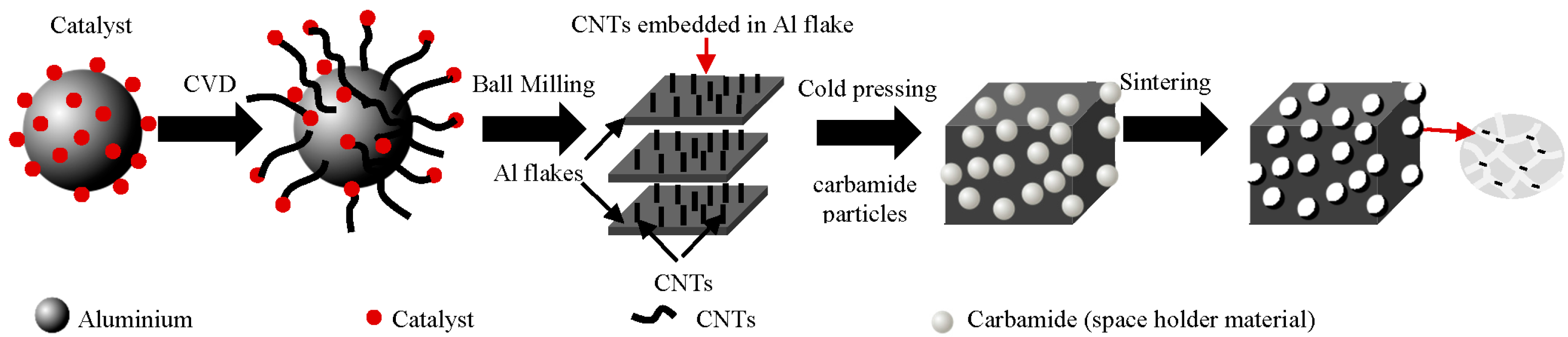 - Wang, J.; Yang, X.; Zhang, M.; Li, J.; Shi, C.; Zhao, N.; Zou, T. A novel approach to obtain in-situ growth carbon nanotube reinforced aluminum foams with enhanced properties. Mater. Lett. 2015, 161, 763–766. [Google Scholar] [CrossRef]