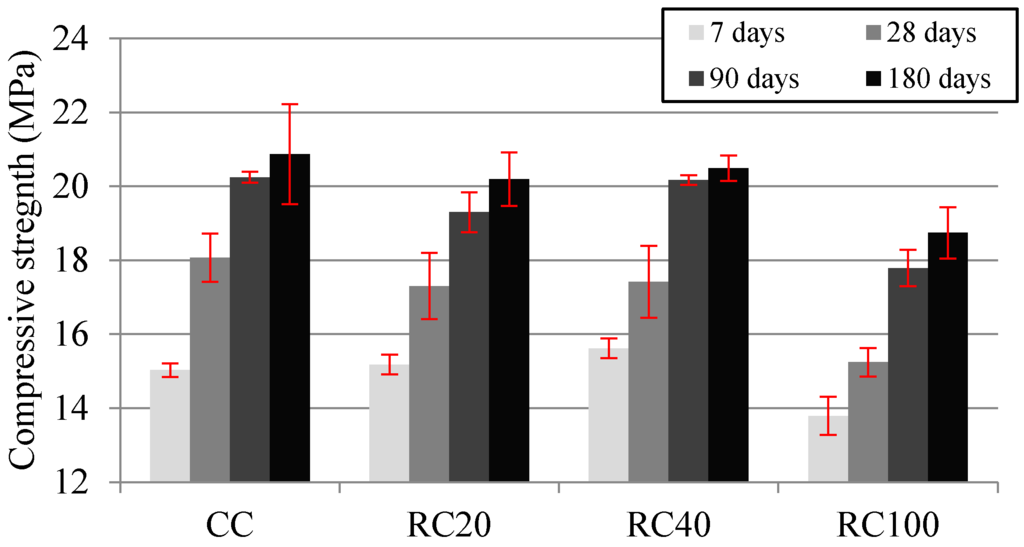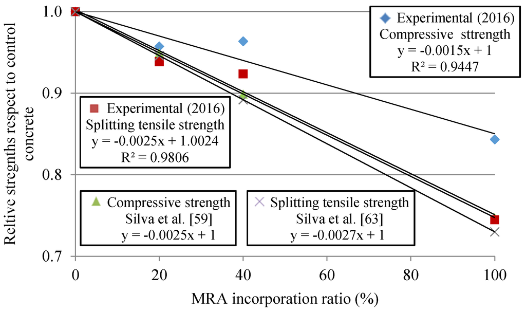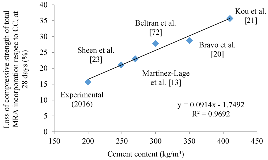 - Comparing the relative strength of the total MRA incorporation compressive strength in cast specimens relative to the control concrete and that of other authors with varying cement content, it was found that the loss of compressive strength is proportionally higher as the strength class increases. The compressive strength in cast specimen reached more than 15 MPa in the total MRA incorporation mix at 28 days, i.e., 15.7% lower than that of the control concrete.