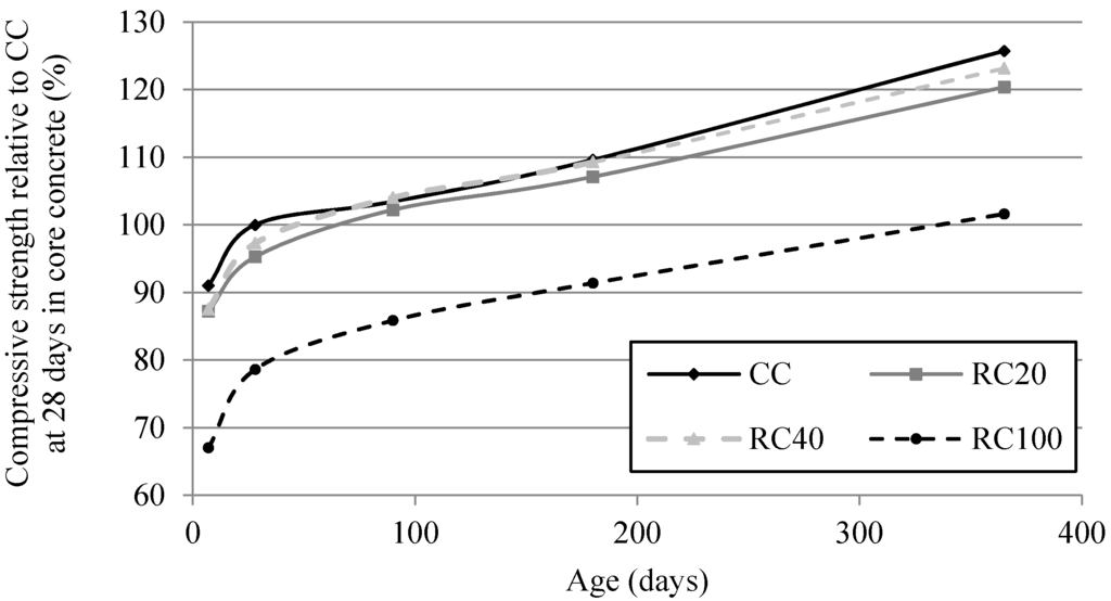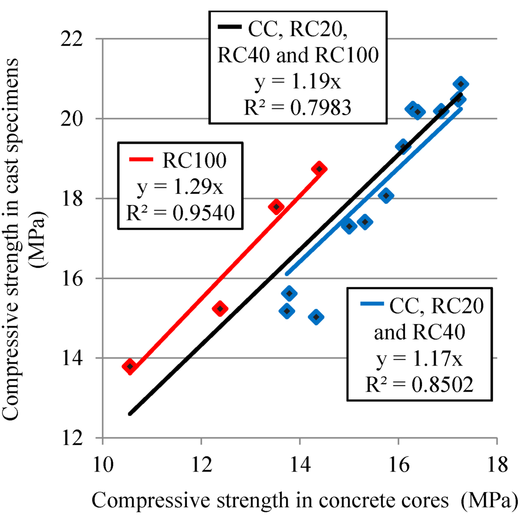 - The ratio between the compressive strength of cast specimens and concrete cores depends on the incorporation ratio, leading to two values; one up to 40% incorporation ratio (1.17) and another for 100% replacements (1.29), in order not to underestimate the latter.