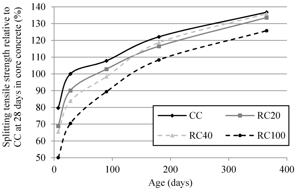 - Full MRA incorporation concrete cores took one year and 180 days to reach control concrete at 28 days values in compressive and splitting tensile strengths respectively, and high long-term development strength potential was found.