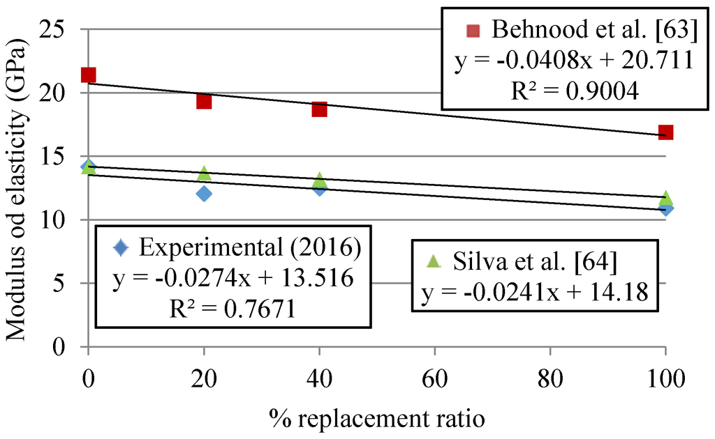 - Silva, R.V.; de Brito, J.; Dhir, R.K. Establishing a relationship between modulus of elasticity and compressive strength of recycled aggregate. J. Clean. Prod. 2016, 112, 2171–2186. [Google Scholar] [CrossRef]
