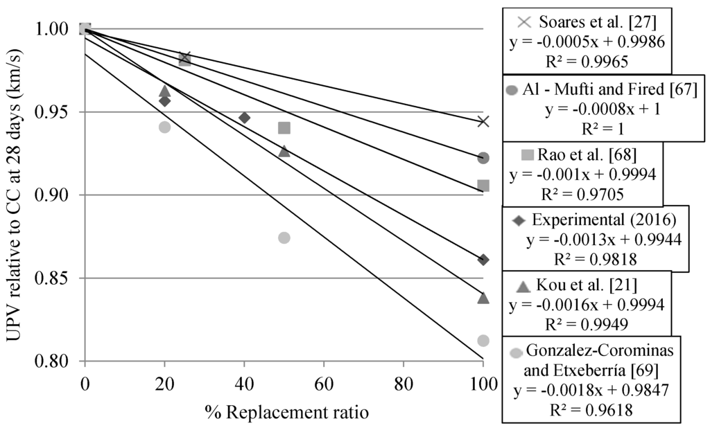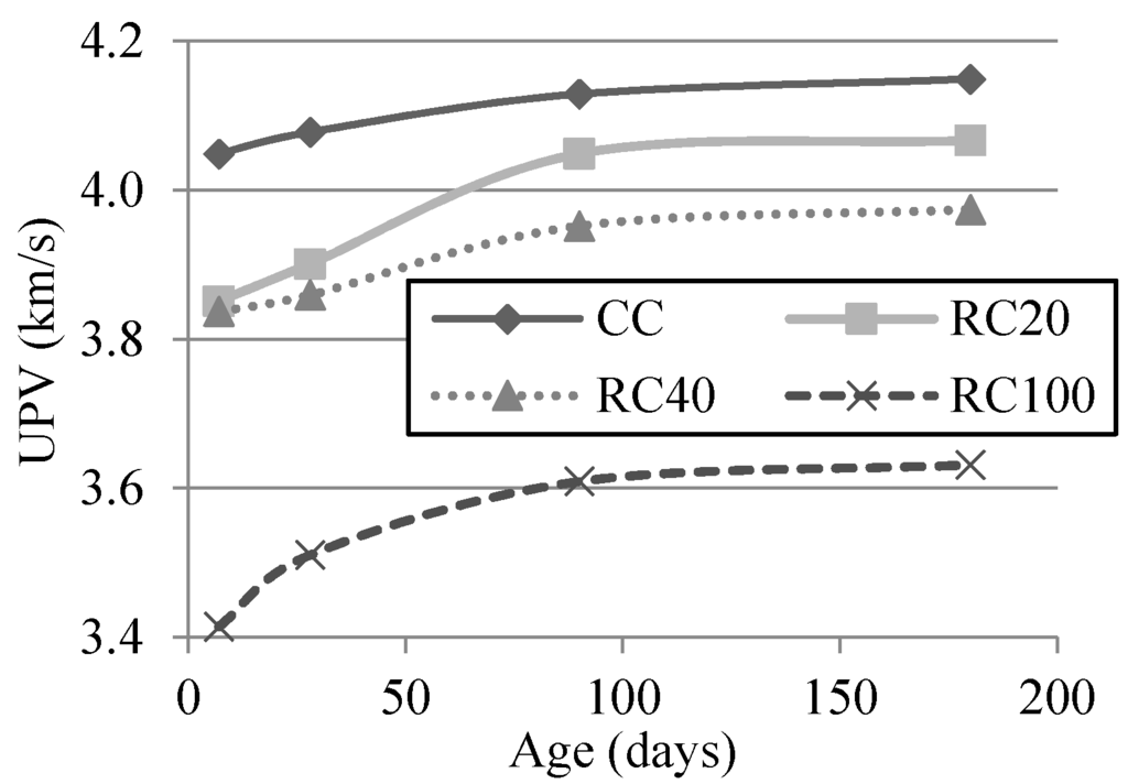 - A reduction in UPV test results associated with MRA incorporation was observed, reaching 16% for full MRA incorporation relative to the control concrete, very similar to that observed in compressive strength.