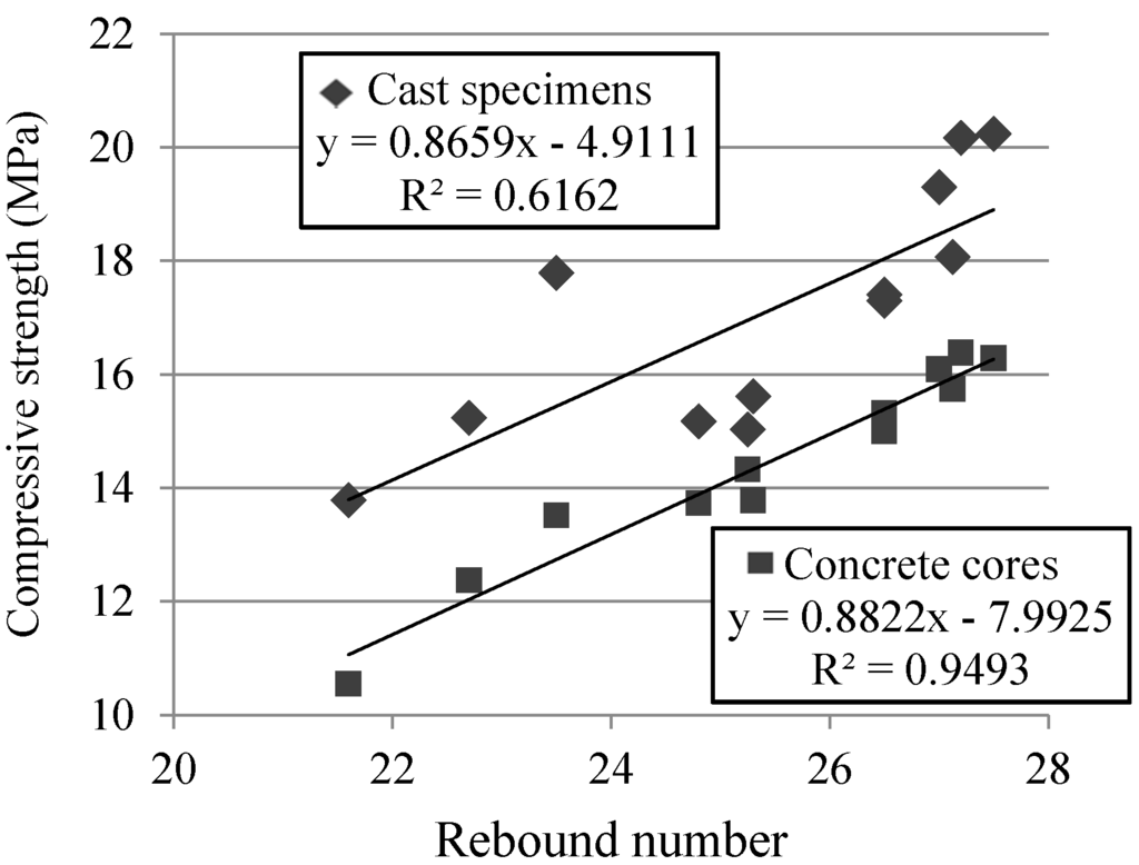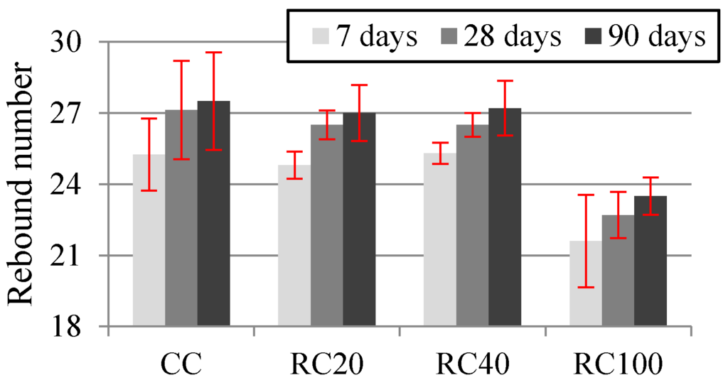 - The Schmidt hammer test results decreased with MRA incorporation, as expected. A good correlation (0.95) between this parameter and core concrete compressive strength was obtained.