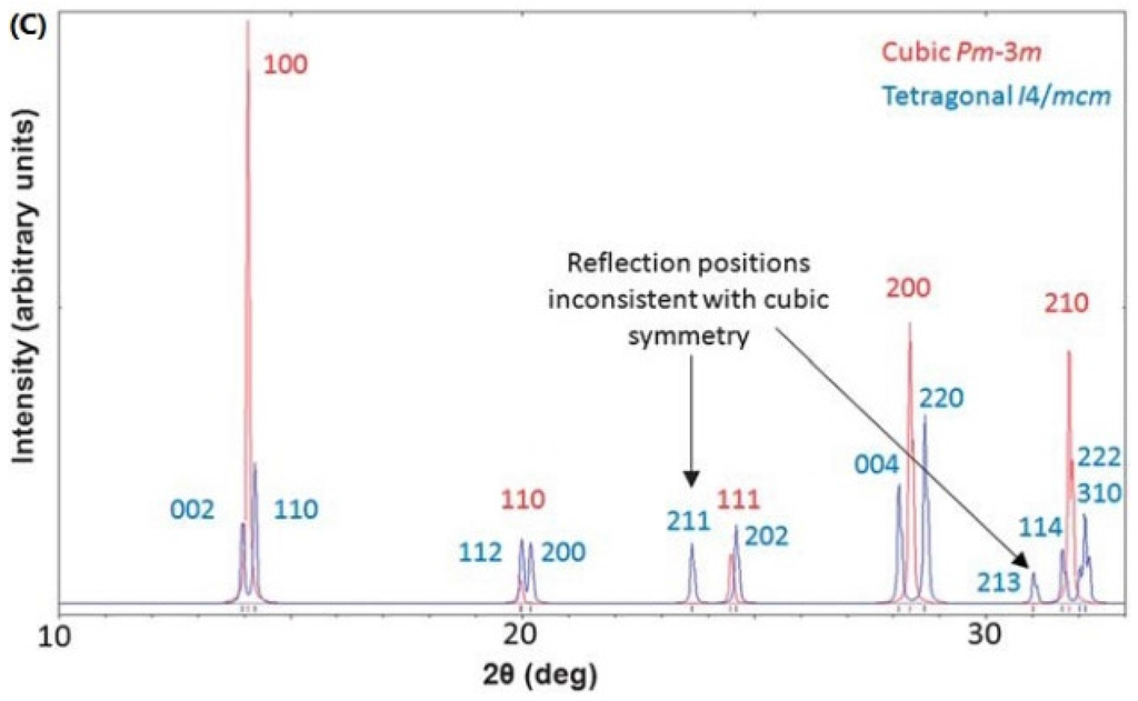 (A) Atomic models of MAPbI3 with cubic phase; and (B) tetragonal phase; (C) the calculated XRD patterns for MAPbI3 in both phases. (A) and (B) are reprinted from reference [64], Copyright © IOP Publishing. Reproduced with permission. All rights reserved; (C) is reprinted from reference [65], Copyright © 2013, Royal Society of Chemistry.