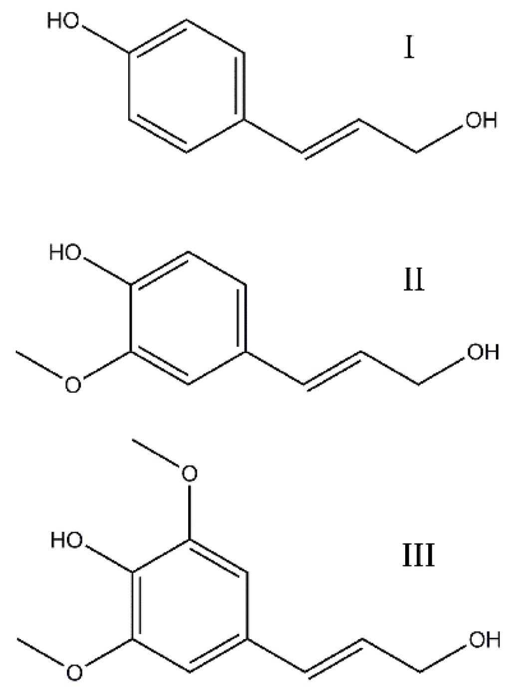 The primary precursors and building units of lignin: p-courmaryl alcohol (I); coniferyl alcohol (II); and sinapyl alcohol (III).