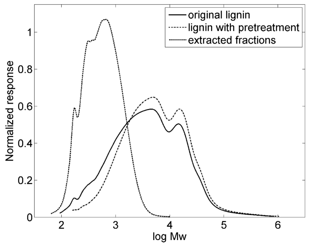 Pretreatment of lignin was performed by the procedure described above, resulting in a concentration of lignin in the DEC phase of about 7 wt %. The original lignin, the pretreated lignin and the fractions extracted in DEC were analyzed in duplicate by SEC after acetylation, monitored simultaneously by RI and UV detectors. After calibration and normalization, highly repeatable molecular mass distributions (MMD) could be noticed for all the three samples. As illustrated in Figure 2, the shape of the MMD of the original and the pretreated lignin, respectively, are rather similar although the pretreated lignin shows a slightly more narrow distribution profile. The extracted fractions distributes in small molecular mass range. Obviously, the pretreatment procedure has been able to remove the small dissoluble fractions from the original lignin. Calculated MMD of the original lignin, pretreated lignin and extracted fractions are shown in Table 1. The pretreatment increased both the weight average molar mass (Mw) and the number average molar mass (Mn) of the lignin from 14,000 to 16,000 and 1400 to 2400, respectively, while the polydipersity (PD) index (Mw/Mn) was decreased from 9.9 to 6.8. The latter means that the pretreatment makes the distribution of molecular mass of the lignin more uniform.