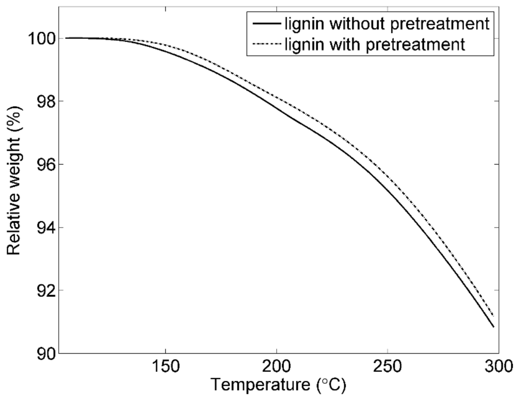 Thermal gravimetric analysis (TGA) was utilized to characterize the thermal behavior of the lignin with and without pretreatment. As shown in the Figure 3, their thermal behaviors are overall similar. The decomposition temperatures (Td) of the lignin with and without pretreatment are 255 and 257 °C, respectively, which means that both lignins are stable below these temperatures. Both Td and volatiles (V) at 250 °C for the lignin with pretreatment are slightly higher than those of the original lignin (Table 2).