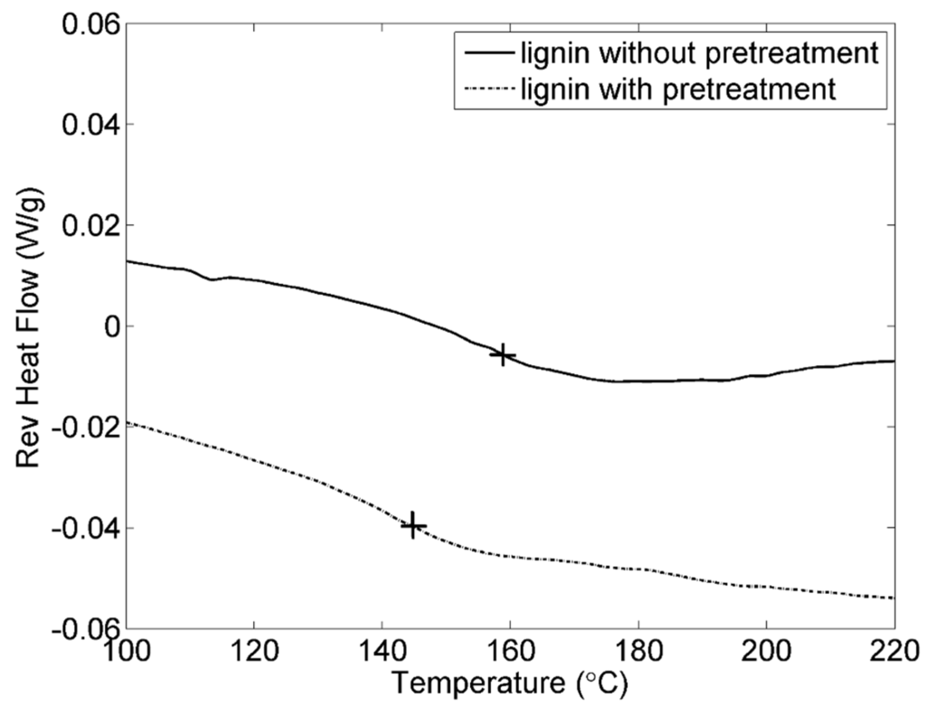 The glass transition temperature (Tg) of the lignin with and without pretreatment was determined by differential scanning calorimetry (DSC) analysis. Between 1 and 4 mg samples were put in a DSC capsule and were dried for 2 hours at 105 °C. After cooling in a desiccator, the capsule was sealed airtight. The glass transition was determined with modulated DSC in a DSC Q 1000 from TA Instruments. A ramp from 20 °C up to 200 °C was performed with a rate of 3 °C/min. A sinusoidal modulation of the temperature of ±1 °C/60 s was superimposed on the temperature ramp to enhance the sensitivity. The Tg was determined from the midpoint of the reversing heat flow decrease. All report data are averages of duplicates.