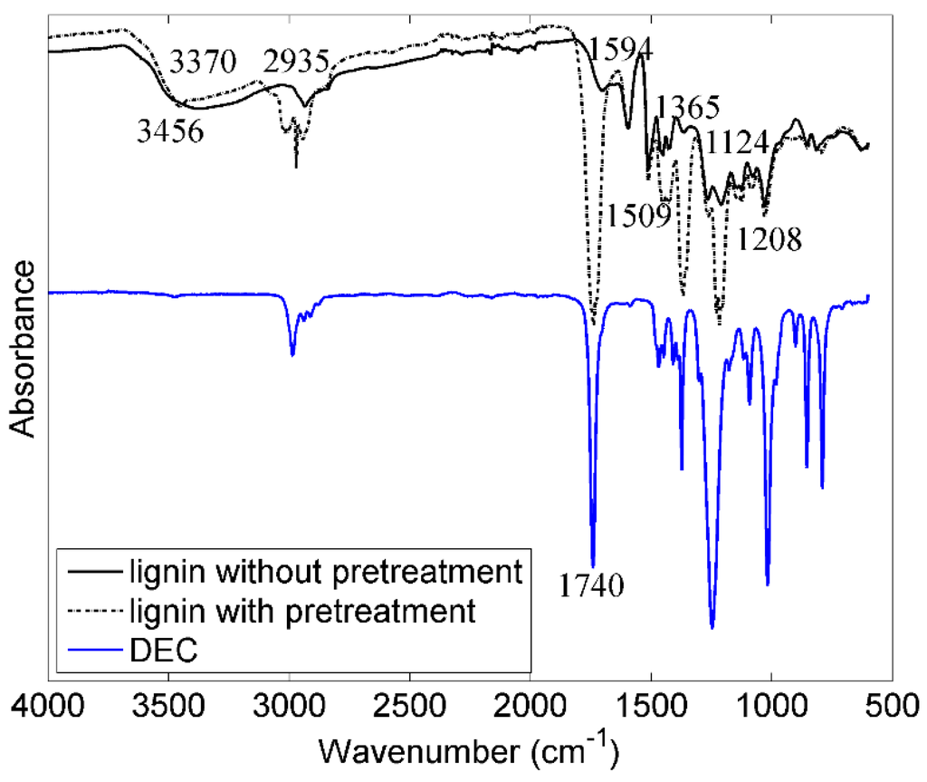 FTIR spectrum of DEC and of lignin with and without pretreatment. The lignin spectra were normalized based on the peak at wavenumber 1594 cm−1.