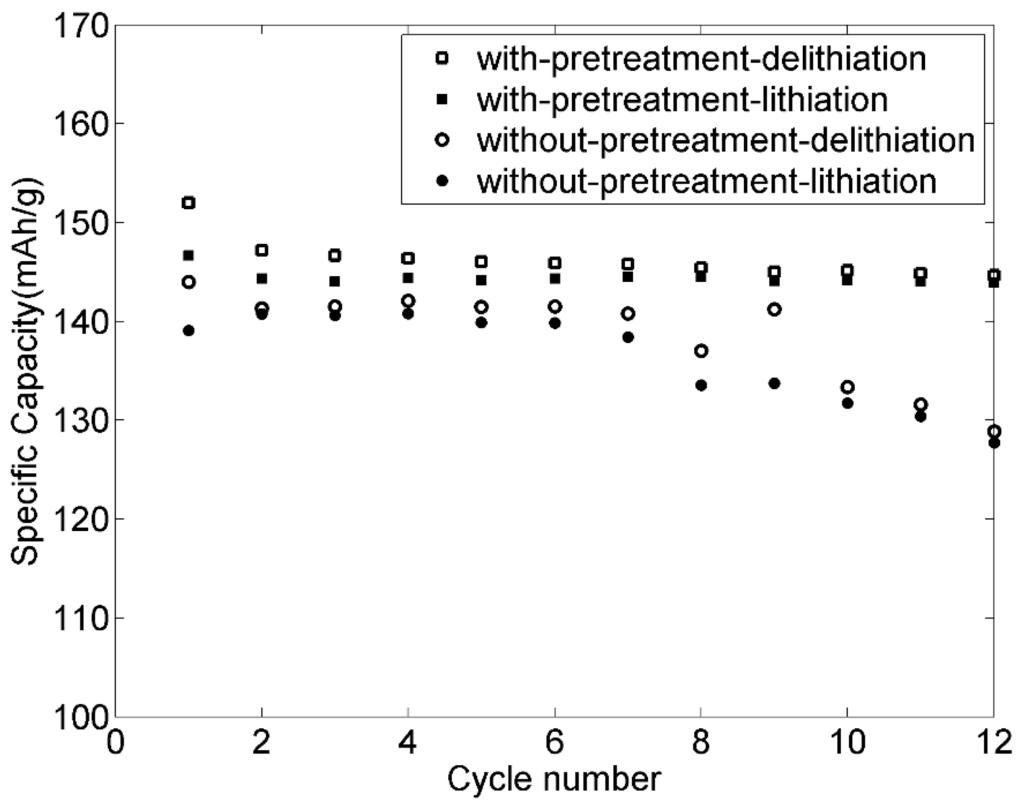 Specific capacity versus cycle numbers for 82-9-9 LiFePO4 positive electrodes with and without pretreatment cycled at C/10.